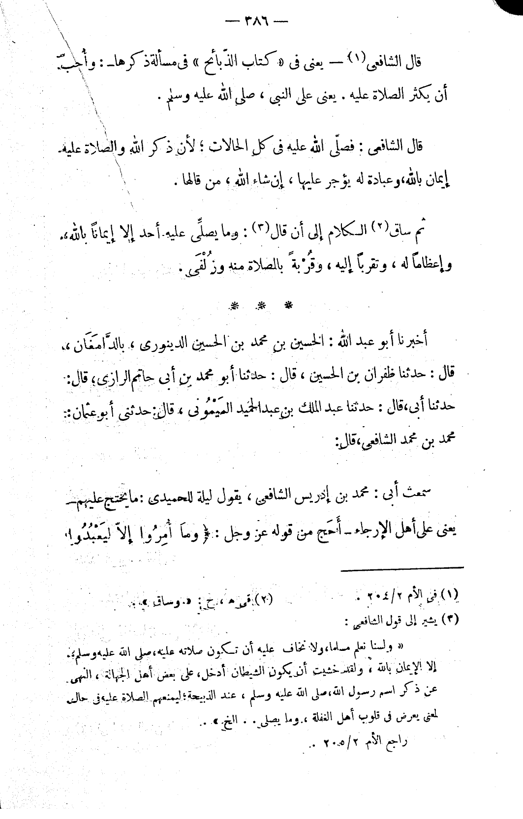 «ولسنا نعلم مسلما، ولا نخاف عليه أن تكون صلاته عليه، صلى الله عليه وسلم، إلا الإيمان بالله، ولقد خشيت أن يكون الشيطان أدخل، على بعض أهل الجهالة، النهي عن ذكر اسم رسول الله، صلى الله عليه وسلم، عند الذبيحة؛ ليمنعهم الصلاة عليه في حال لمعنى يعرض في قلوب أهل الغفلة، وما يصلى. . الخ».