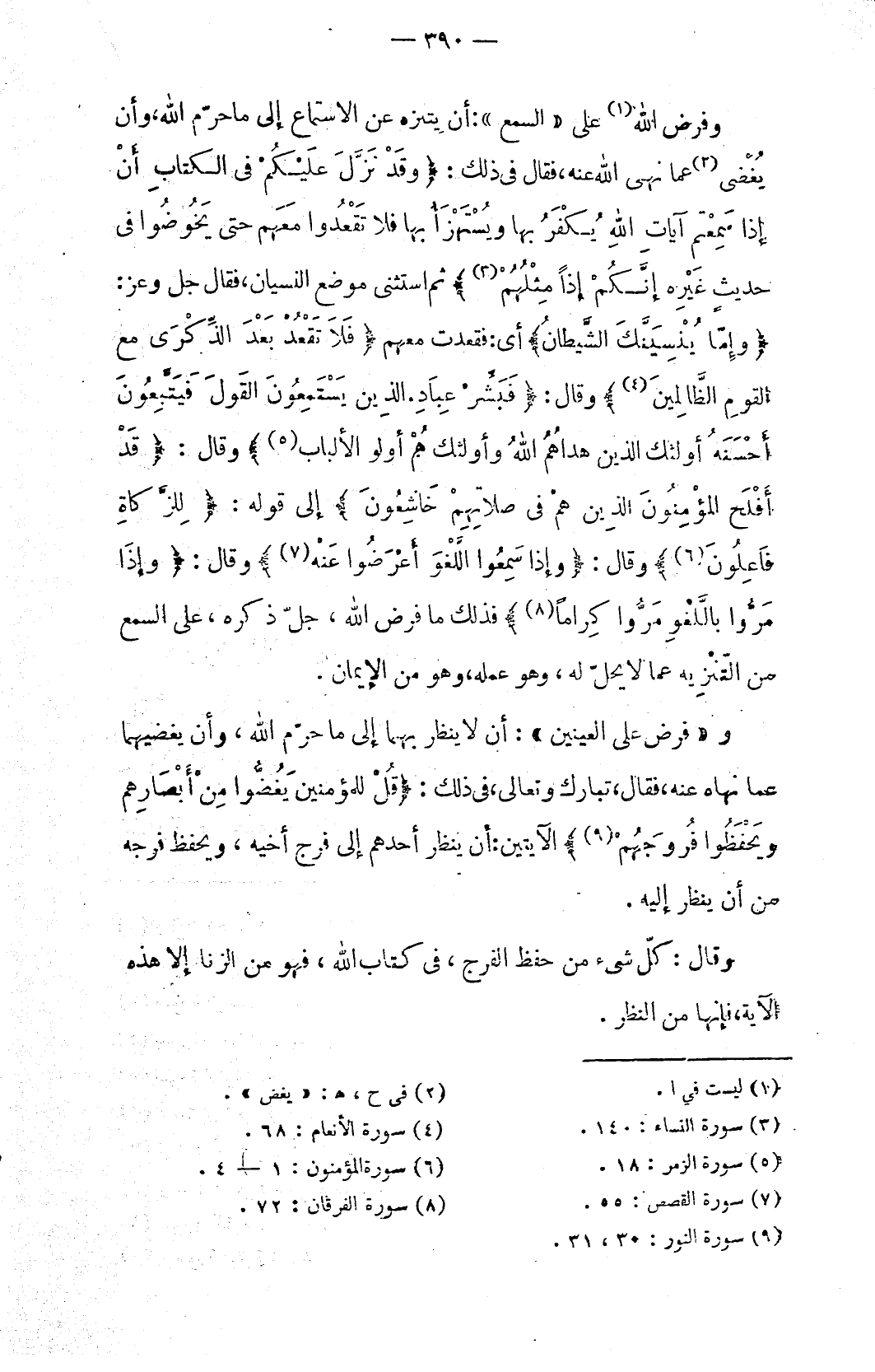 وفرض الله (١) على «السمع»: أن يتنزه عن الاستماع إلى ما حرّم الله، وأن يُغْضى (٢) عما نهى الله عنه، فقال في ذلك: {وَقَدْ نَزَّلَ عَلَيْكُمْ فِي الْكِتَابِ أَنْ إِذَا سَمِعْتُمْ آيَاتِ اللَّهِ يُكْفَرُ بِهَا وَيُسْتَهْزَأُ بِهَا فَلَا تَقْعُدُوا مَعَهُمْ حَتَّى يَخُوضُوا فِي حَدِيثٍ غَيْرِهِ إِنَّكُمْ إِذًا مِثْلُهُمْ (٣)} ثم استثنى موضع النسيان، فقال جل وعز: {وَإِمَّا يُنْسِيَنَّكَ الشَّيْطَانُ} أي: فقعدت معهم: {فَلَا تَقْعُدْ بَعْدَ الذِّكْرَى مَعَ الْقَوْمِ الظَّالِمِينَ (٤)} وقال: {فَبَشِّرْ عِبَادِ (١٧) الَّذِينَ يَسْتَمِعُونَ الْقَوْلَ فَيَتَّبِعُونَ أَحْسَنَهُ أُولَئِكَ الَّذِينَ هَدَاهُمُ اللَّهُ وَأُولَئِكَ هُمْ أُولُو الْأَلْبَابِ (٥)} وقال: {قَدْ أَفْلَحَ الْمُؤْمِنُونَ (١) الَّذِينَ هُمْ فِي صَلَاتِهِمْ خَاشِعُونَ} إلى قوله: {لِلزَّكَاةِ فَاعِلُونَ (٦)} وقال: {وَإِذَا سَمِعُوا اللَّغْوَ أَعْرَضُوا عَنْهُ (٧)} وقال: {وَإِذَا مَرُّوا بِاللَّغْوِ مَرُّوا كِرَامًا (٨)} فذلك ما فرض الله، جلّ ذكره، على السمع من التّنْزِيه عما لا يحلّ له، وهو عمله، وهو من الإيمان.