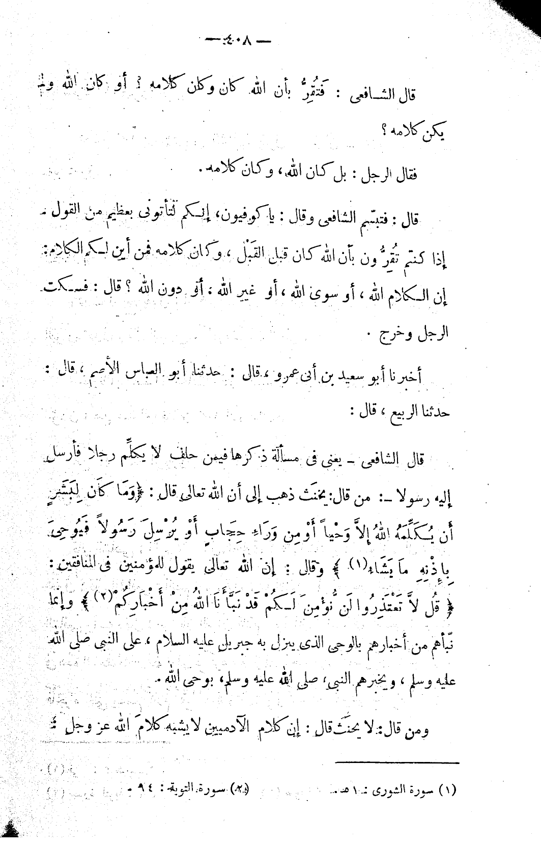 قال الشافعي: فَتُقِرُّ بأن الله كان وكان كلامه، أو كان الله ولم يكن كلامه؟
