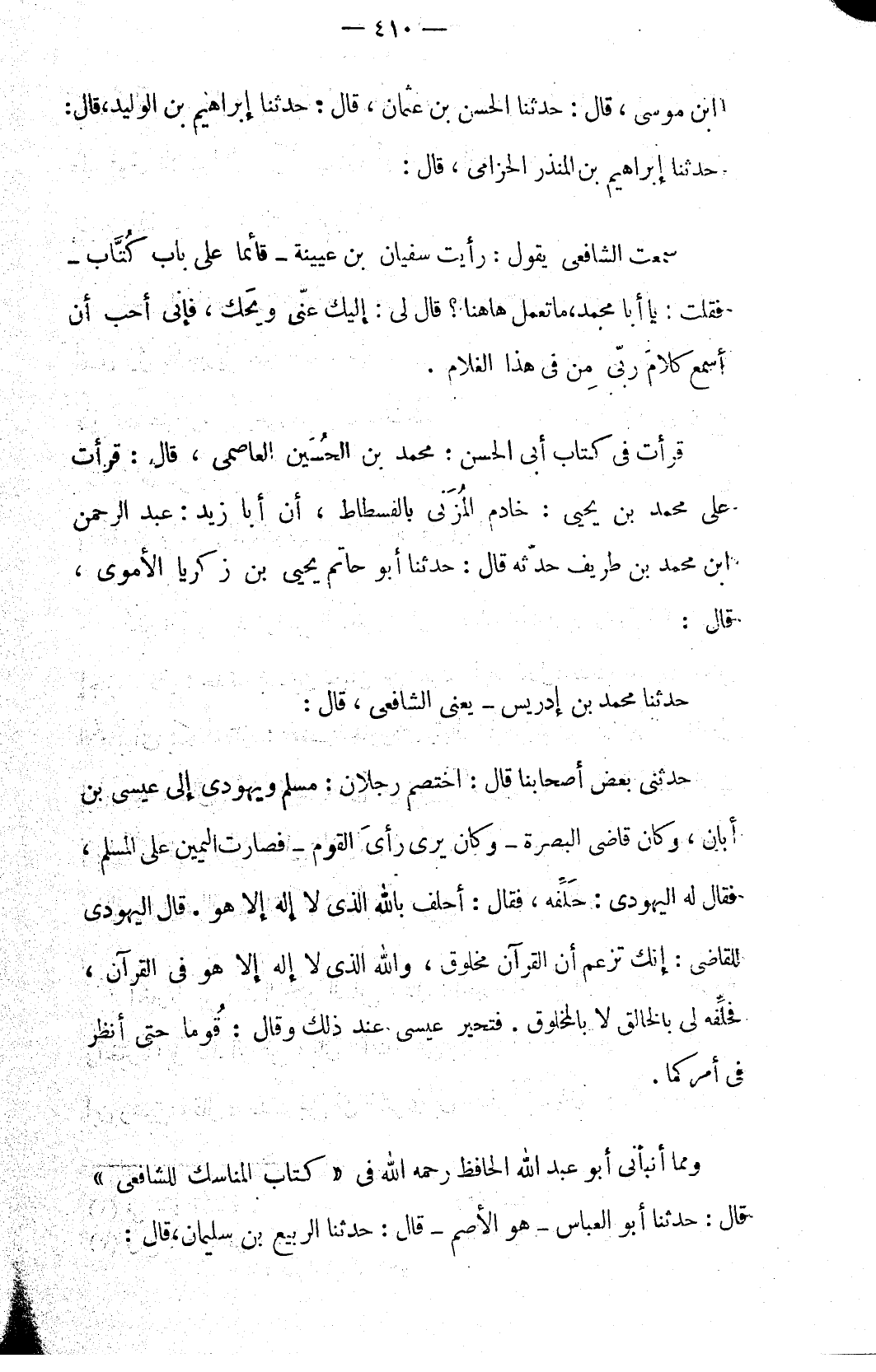 سمعت الشافعي يقول: رأيت سفيان بن عيينة - قائما على باب كُتَّاب - فقلت: يا أبا محمد، ما تعمل هاهنا؟ قال لي: إليك عنّي ويحَك، فإني أحب أن أسمع كلامَ ربّي مِن هذا الغلام.