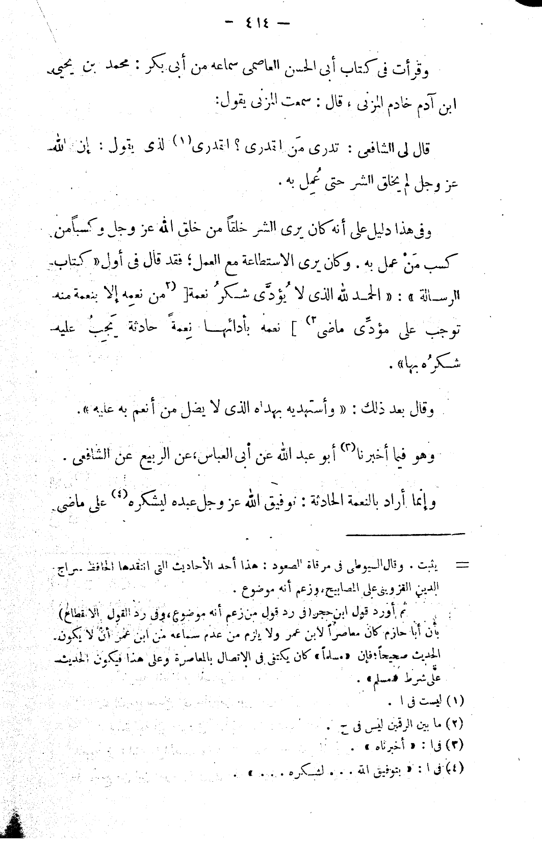 وفي هذا دليل على أنه كان يرى الشر خلقاً من خلق الله عز وجل وكسباً من كسب مَنْ عمل به. وكان يرى الاستطاعة مع العمل؛ فقد قال في أول «كتاب الرسالة»: «الحمد لله الذي لا يُؤدَّى شكرُ نعمة [(٢ من نعمِه إلا بنعمة منه توجب على مؤدِّي ماضي ٢)] نعمه بأدائها نِعمةً حادثة يَجِبُ عليه شكرُه بها».