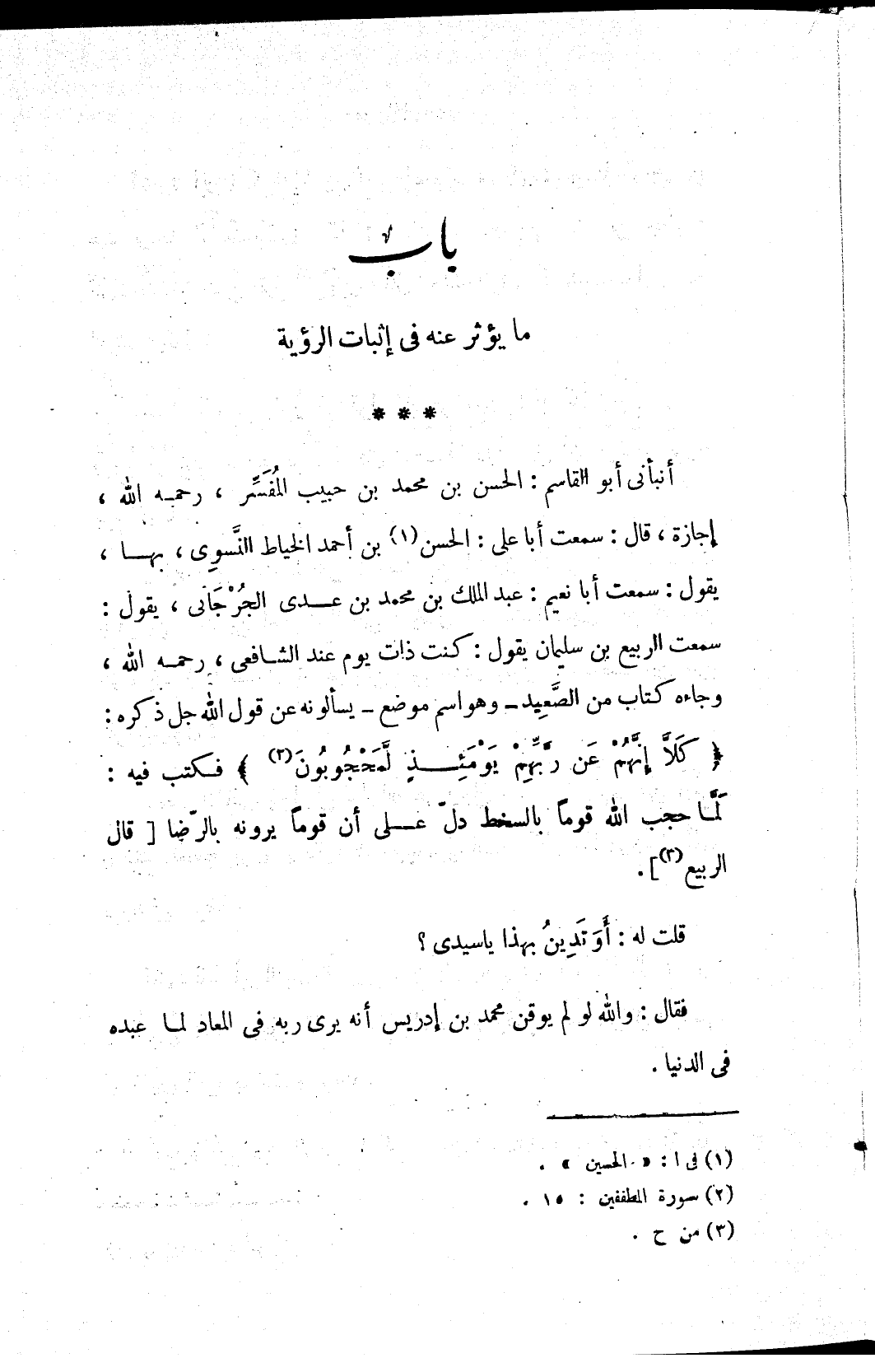 أنبأني أبو القاسم: الحسن بن محمد بن حبيب المُفَسِّر، رحمه الله، إجازة، قال: سمعت أبا علي: الحسن (١) بن أحمد الخياط النَّسوِي، بها، يقول: سمعت أبا نعيم: عبد الملك بن محمد بن عدي الجُرْجَاني، يقول: سمعت الربيع بن سليمان يقول: كنت ذات يوم عند الشافعي، رحمه الله، وجاءه كتاب من الصَّعِيد - وهو اسم موضع - يسألونه عن قول الله جل ذكره: {كَلَّا إِنَّهُمْ عَنْ رَبِّهِمْ يَوْمَئِذٍ لَمَحْجُوبُونَ (٢)} فكتب فيه: لَمَّا حجب الله قوماً بالسخط دلّ على أن قوماً يرونه بالرّضا [قال الربيع (٣)].