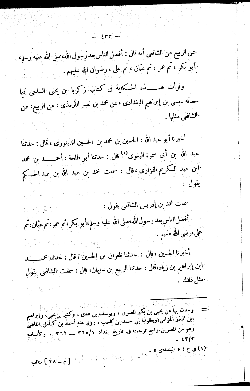 وقرأت هذه الحكاية في كتاب زكريا بن يحيى الساجي فيما حدثه عيسى بن إبراهيم البغدادي، عن محمد بن نصر التِّرمذي، عن الربيع، عن الشافعي مثلها.