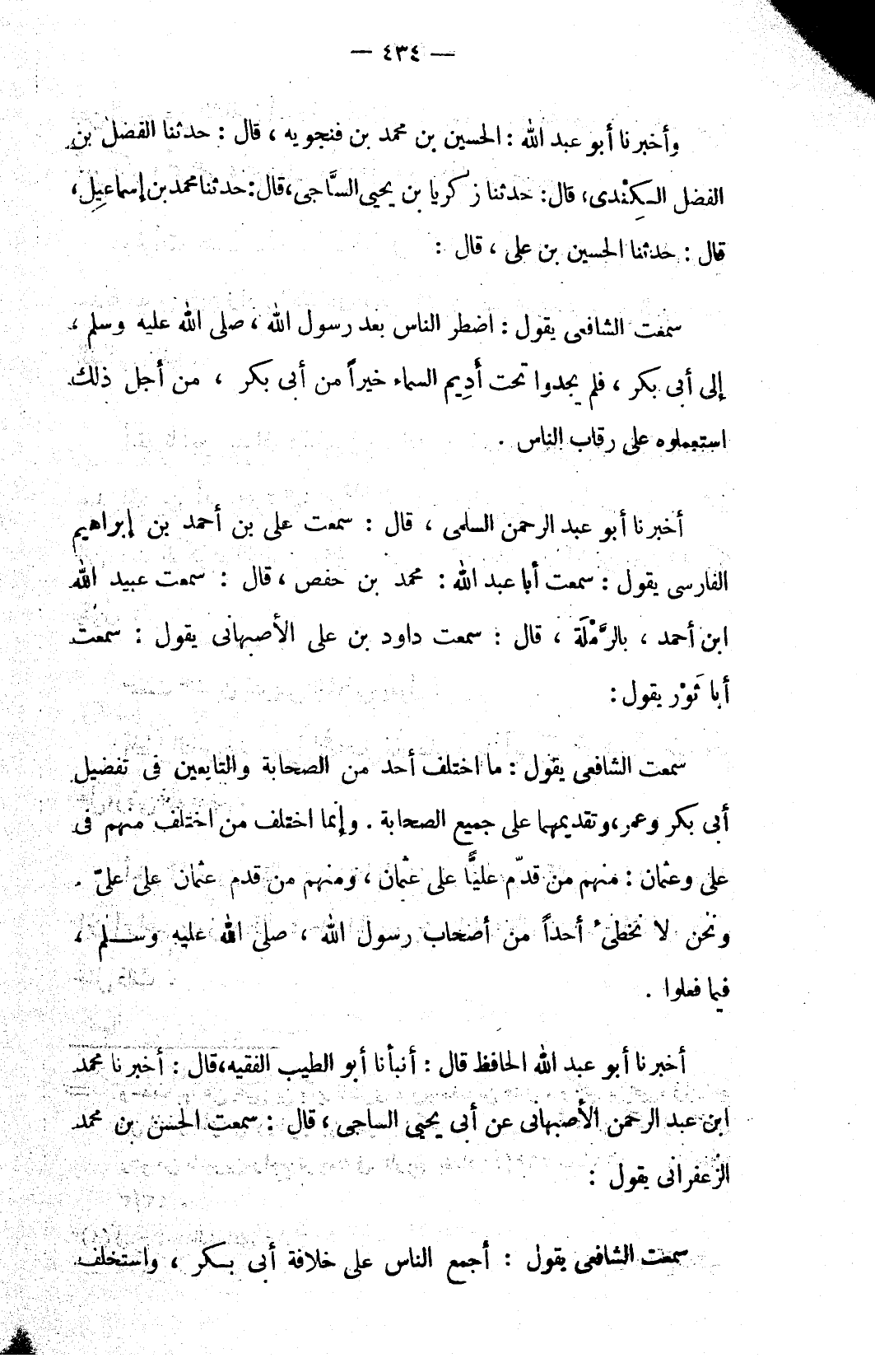 سمعت الشافعي يقول: ما اختلف أحد من الصحابة والتابعين في تفضيل أبي بكر وعمر، وتقديمهما على جميع الصحابة. وإنما اختلف من اختلف منهم في علي وعثمان: منهم من قدَّم عليًّا على عثمان، ومنهم من قدم عثمان على عليّ. ونحن لا نخطئ أحداً من أصحاب رسول الله، صلى الله عليه وسلم، فيما فعلوا.