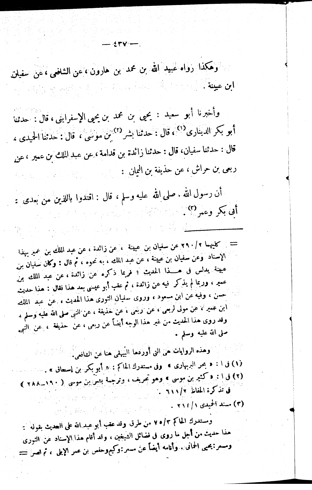 وأخبرنا أبو سعيد: يحيى بن محمد بن يحيى الإسفرايني، قال: حدثنا أبو بكر الديناري (١)، قال: حدثنا بشر (٢) بن موسى، قال: حدثنا الحميدي، قال: حدثنا سفيان، قال: حدثنا زائدة بن قدامة، عن عبد الملك بن عمير، عن ربعي بن حراش، عن حذيفة بن اليمان: