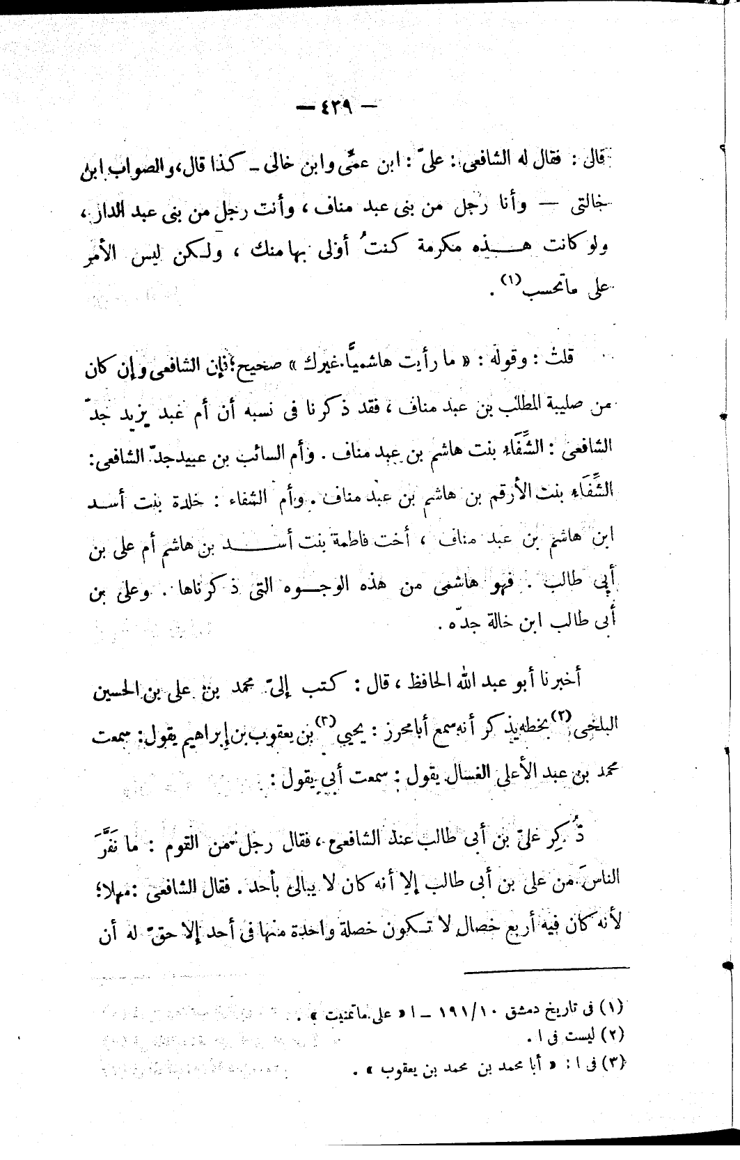 قلت: وقوله: «ما رأيت هاشميًّا غيرك» صحيح؛ فإن الشافعي وإن كان من صليبة المطلب بن عبد مناف، فقد ذكرنا في نسبه أن أم عبد يزيد جدّ الشافعي: الشِّفَاءُ بنت هاشم بن عبد مناف. وأم السائب بن عبيد جدّ الشافعي: الشِّفَاء بنت الأرقم بن هاشم بن عبد مناف. وأم الشفاء: خلدة بنت أسد ابن هاشم بن عبد مناف، أخت فاطمة بنت أسد بن هاشم أم علي بن أبي طالب. فهو هاشمي من هذه الوجوه التي ذكرناها. وعلي بن أبي طالب ابن خالة جدّه.