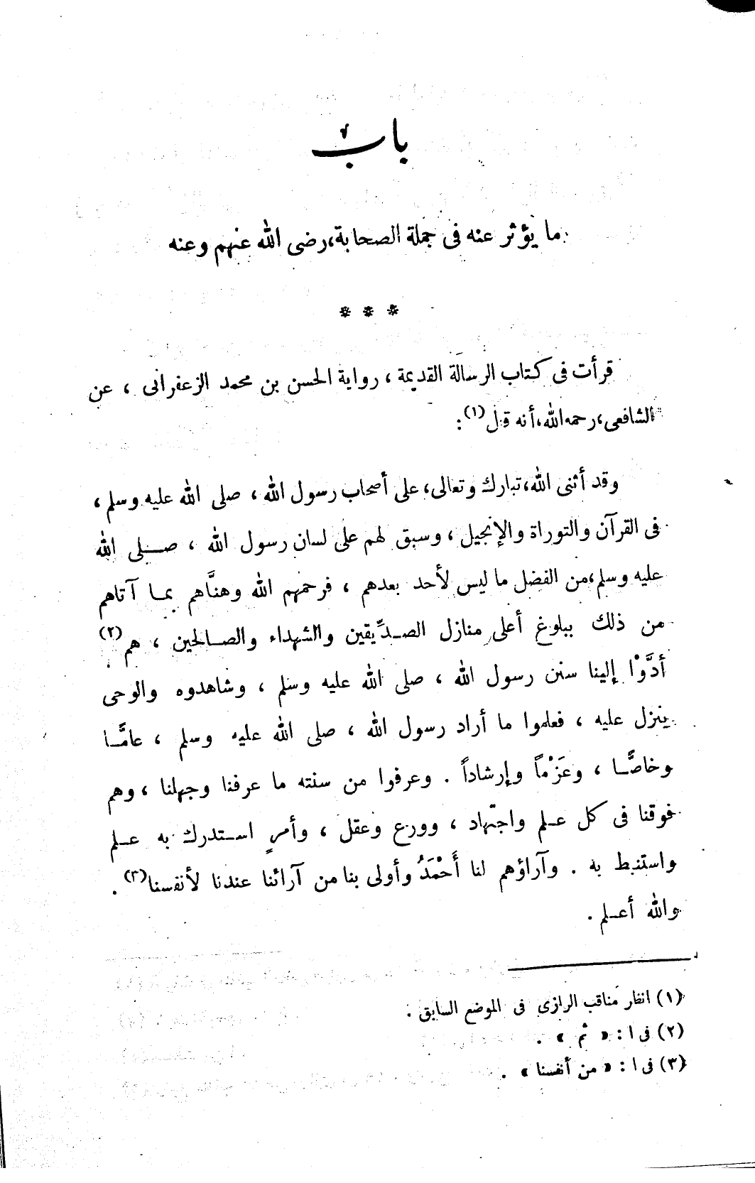 قرأت في كتاب الرسالة القديمة، رواية الحسن بن محمد الزعفراني، عن الشافعي، رحمه الله، أنه قال (١):