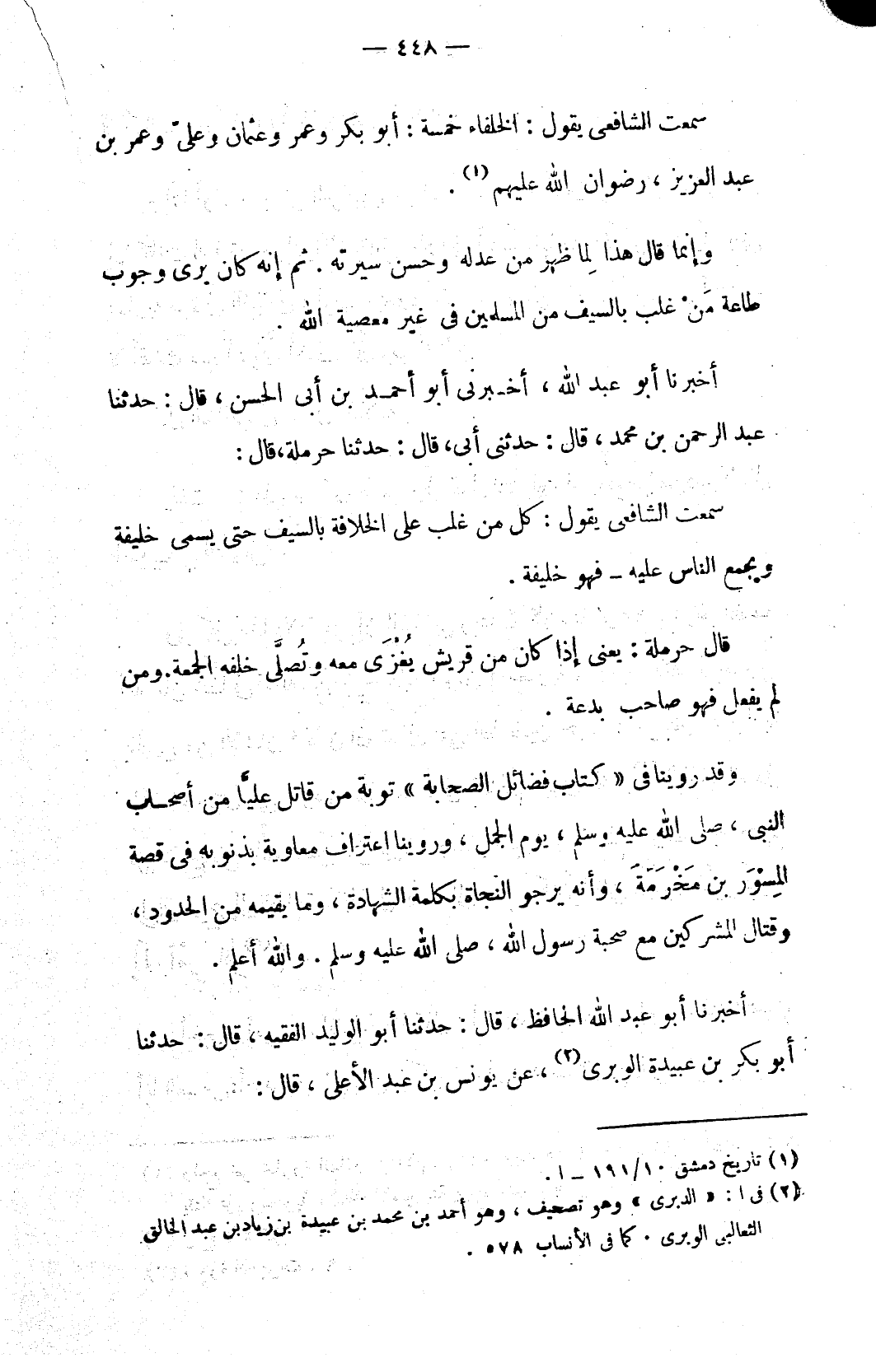 سمعت الشافعي يقول: الخلفاء خمسة: أبو بكر وعمر وعثمان وعليّ وعمر بن عبد العزيز، رضوان الله عليهم (١).