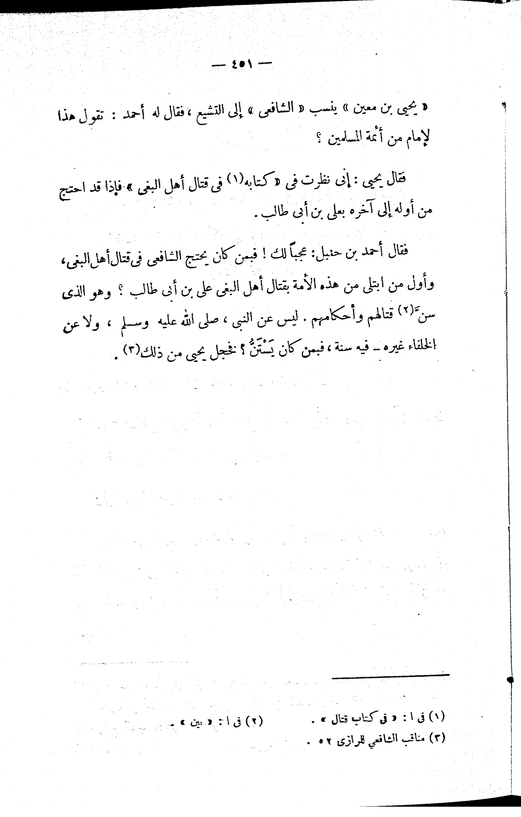 فقال أحمد بن حنبل: عجباً لك! فبمن كان يحتج الشافعي في قتال أهل البغي، وأول من ابتلي من هذه الأمة بقتال أهل البغي علي بن أبي طالب؟ وهو الذي سنَّ (٢) قتالهم وأحكامهم. ليس عن النبي، صلى الله عليه وسلم، ولا عن الخلفاء وغيره – فيه سنة، فبمن كان يَسْتَنُّ؟ فخجل يحيى من ذلك (٣).