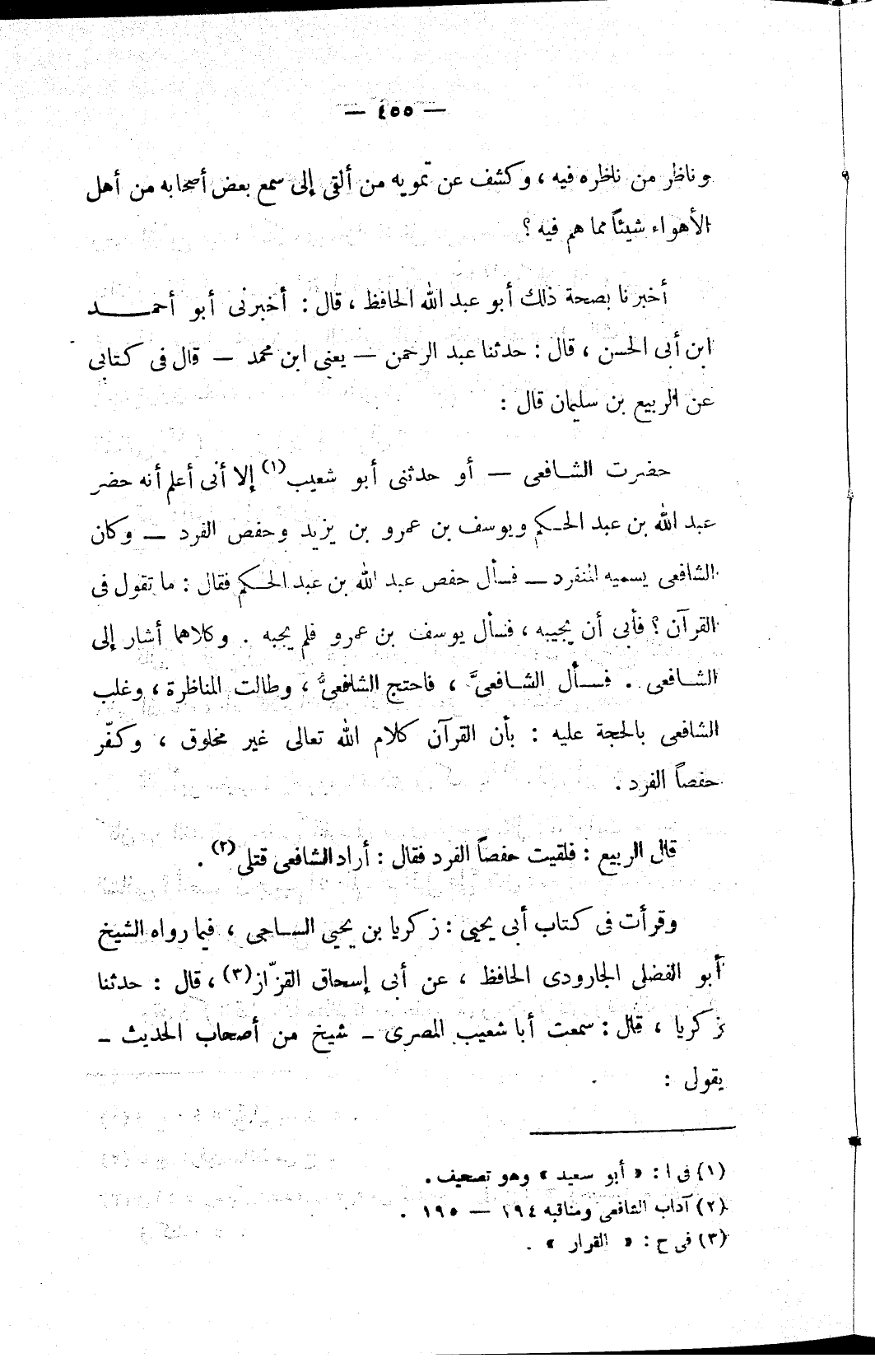 حضرت الشافعي – أو حدثني أبو شعيب (١) إلا أني أعلم أنه حضر عبد الله بن عبد الحكم ويوسف بن عمرو بن يزيد وحفص الفرد – وكان الشافعي يسميه المنفرد – فسأل حفص عبد الله بن عبد الحكم فقال: ما تقول في القرآن؟ فأبى أن يجيبه، فسأل يوسف بن عمرو فلم يجبه. وكلاهما أشار إلى الشافعي. فسأل الشافعيَّ، فاحتج الشافعيَّ، وطالت المناظرة، وغلب الشافعي بالحجة عليه: بأن القرآن كلام الله تعالى غير مخلوق، وكفّر حفصاً الفرد.