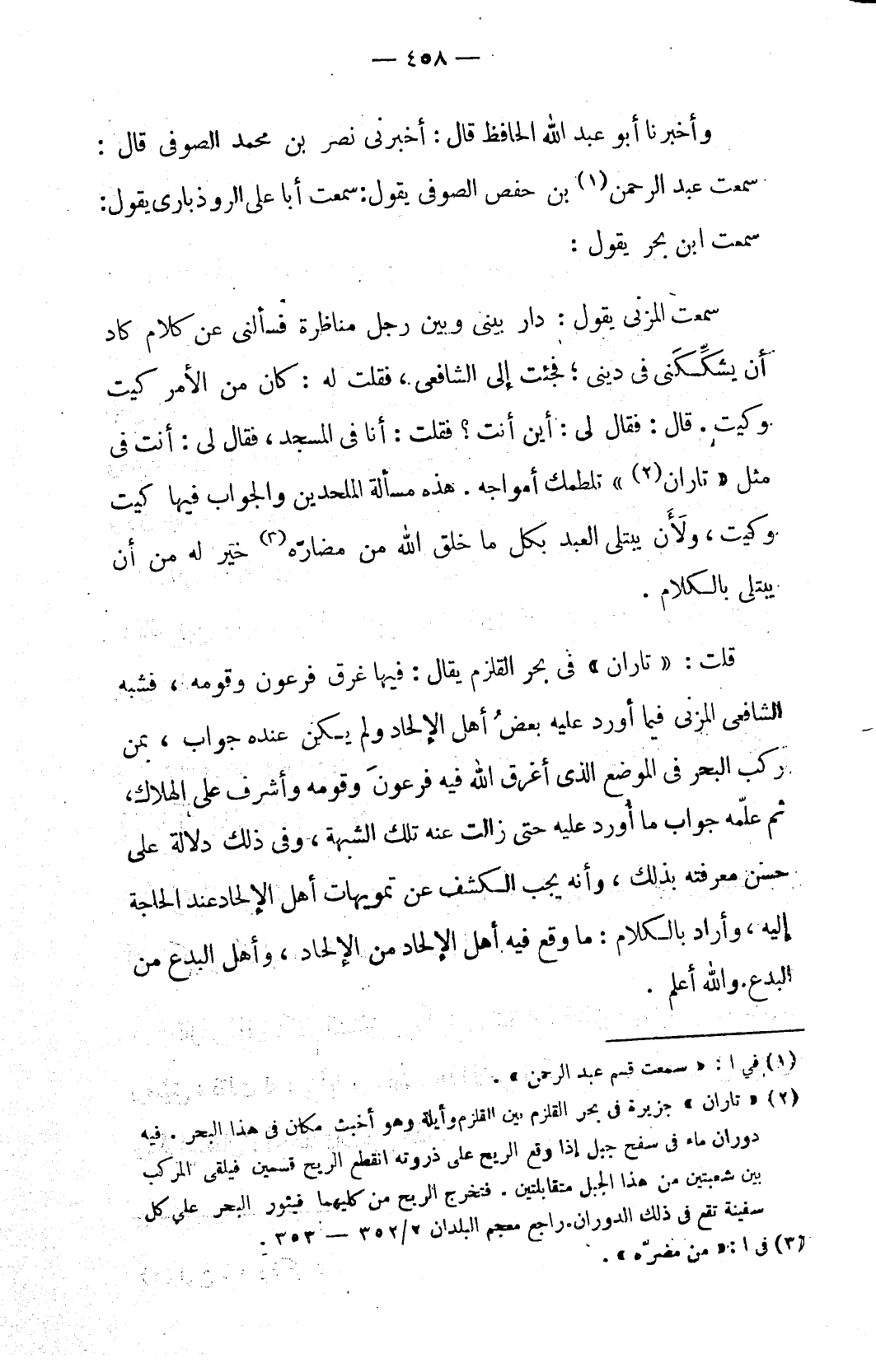 قلت: «تاران» في بحر القلزم يقال: فيها غرق فرعون وقومه، فشبه الشافعي المزني فيما أورد عليه بعضُ أهل الإلحاد ولم يكن عنده جواب، بمن ركب البحر في الموضع الذي أغرق الله فيه فرعونَ وقومه وأشرف على الهلاك، ثم علّمه جواب ما أُورد عليه حتى زالت عنه تلك الشبهة، وفي تلك دلالة على حسن معرفته بذلك، وأنه يجب الكشف عن تمويهات أهل الإلحاد عند الحاجة إليه، وأراد بالكلام: ما وقع فيه أهل الإلحاد من الإلحاد، وأهل البدع من البدع. والله أعلم.