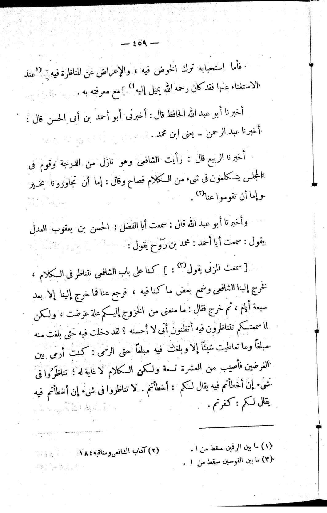 [سمعت المزني يقول (٣):] كنا على باب الشافعي نتناظر في الكلام، فخرج إلينا الشافعي وسمع بعض ما كنا فيه، فرجع عنا فما خرج إلينا إلا بعد سبعة أيام، ثم خرج فقال: ما منعني من الخروج إليكم علة عرضت، ولكن لما سمعتكم تتناظرون فيه أتظنون أني لا أحسنه؟ لقد دخلت فيه حتى بلغت منه مبلغاً وما تعاطيت شيئاً إلا وبلغت فيه مبلغاً حتى الرّمي: كنت أرمي بين الغرضين فأصيب من العشرة تسعة ولكن الكلام لا غاية له؛ تناظَرُوا في شيء إن أخطأتم فيه يقال لكم: أخطأتم. ولا تناظروا في شيء إن أخطأتم فيه يقال لكم: كفرتم.