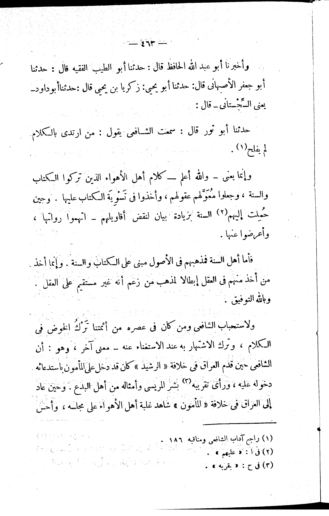 ولاستحباب الشافعي ومن كان في عصره من أئمتنا تَرْكَ الخوض في الكلام، وترك الاشتهار به عند الاستغناء عنه - معنى آخر، وهو: أن الشافعي حين قدم العراق في خلافة «الرشيد» كان قد دخل على المأمون باستدعائه دخوله عليه، ورأى تقريبه (٣) بشر المريسي وأمثاله من أهل البدع. وحين عاد إلى العراق في خلافة «المأمون» شاهد غلبة أهل الأهواء على مجلسه، وأحس