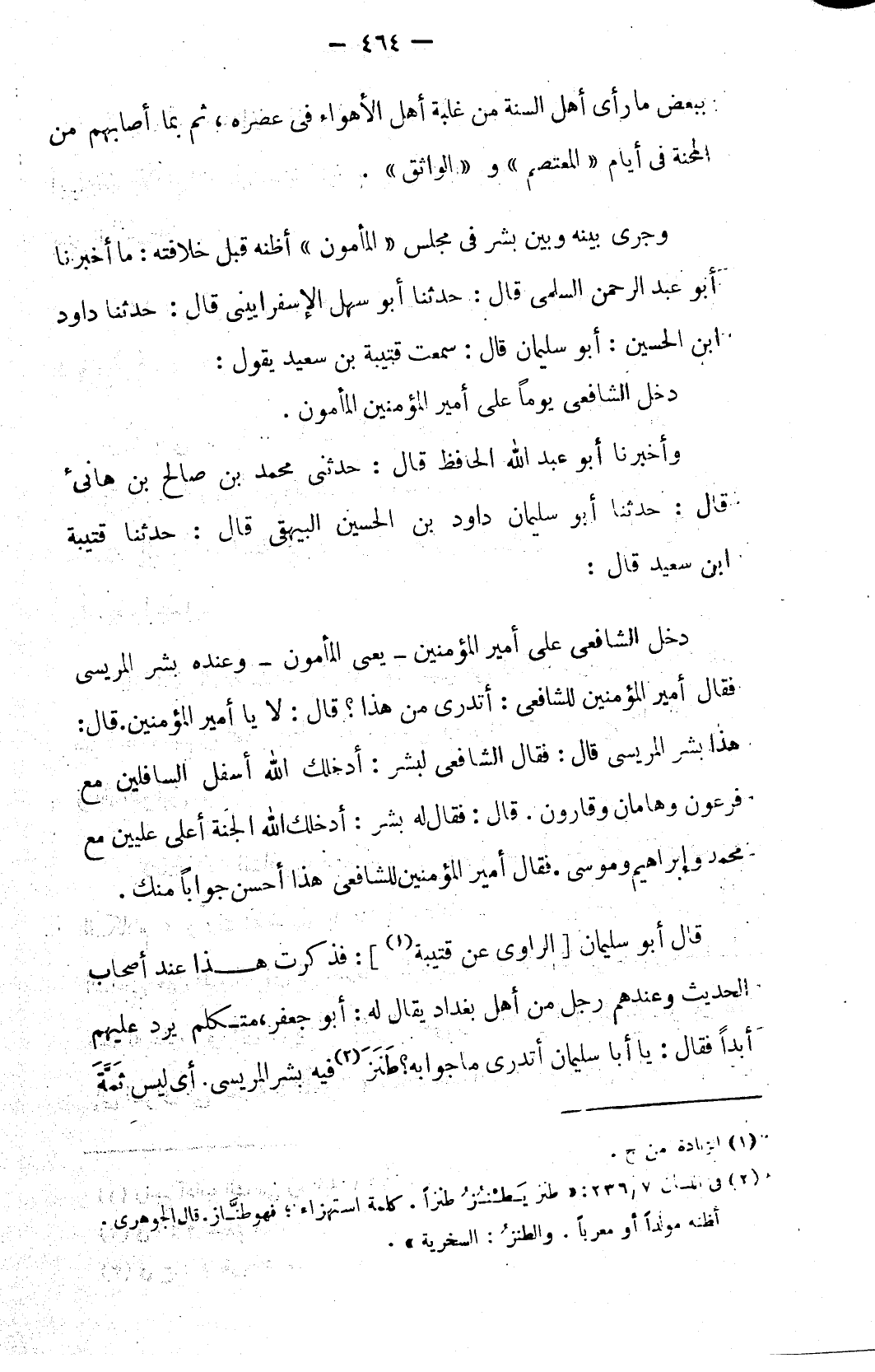 وجرى بينه وبين بشر في مجلس «المأمون» أظنه قبل خلافته: ما أخبرنا أبو عبد الرحمن السلمي قال: حدثنا أبو سهل الإسفراييني قال: حدثنا داود ابن الحسين: أبو سليمان قال: سمعت قتيبة بن سعيد يقول: