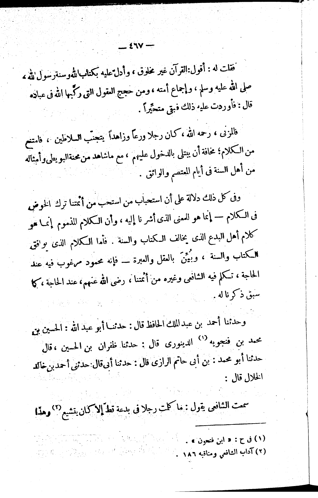 وفي كل ذلك دلالة على أن استحباب من استحب أئمتنا ترك الخوض في الكلام - إنما هو للمعنى الذي أشرنا إليه، وأن الكلام المذموم إنما هو كلام أهل البدع الذي يخالف الكتاب والسنة. فأما الكلام الذي يوافق الكتاب والسنة، وبُيِّنَ بالعقل والعبرة - فإنه محمود مرغوب فيه عند الحاجة، تكلم فيه الشافعي وغيره من أئمتنا، رضي الله عنهم، عند الحاجة، كما سبق ذكرنا له.
