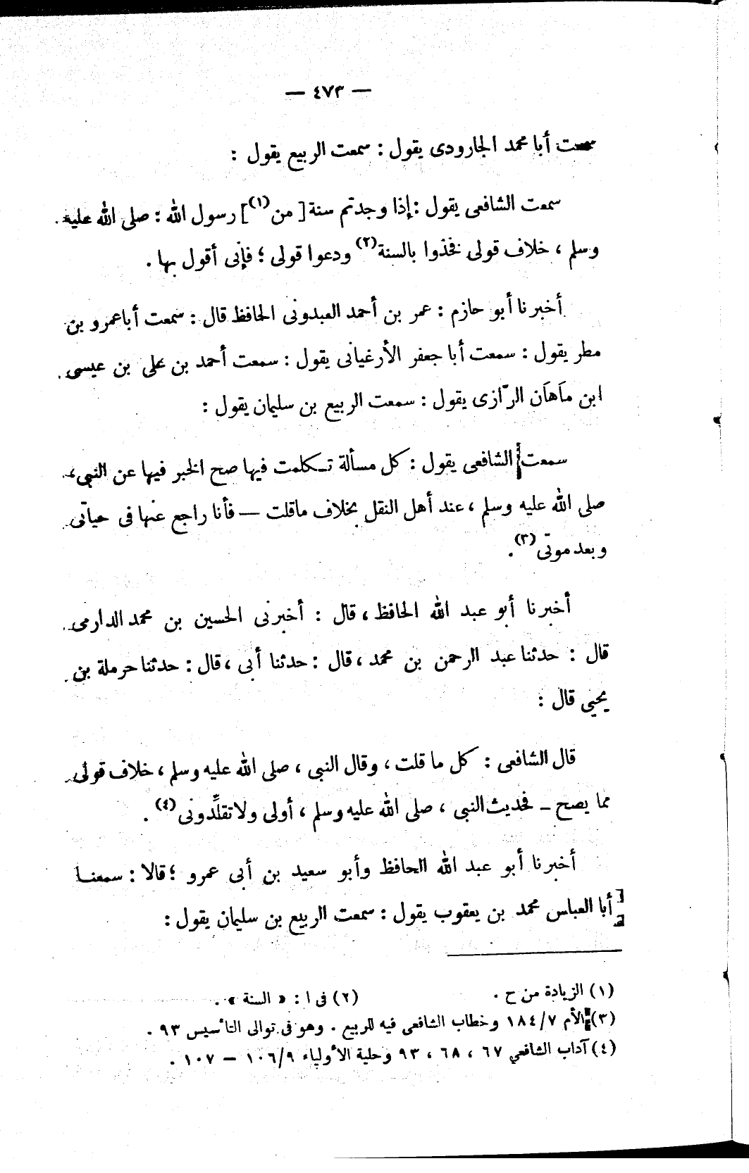 سمعت الشافعي يقول: كل مسألة تكلمت فيها صح الخبر فيها عن النبي، صلى الله عليه وسلم، عند أهل النقل بخلاف ما قلت – فأنا راجع عنها في حياتي وبعد موتي (٣).