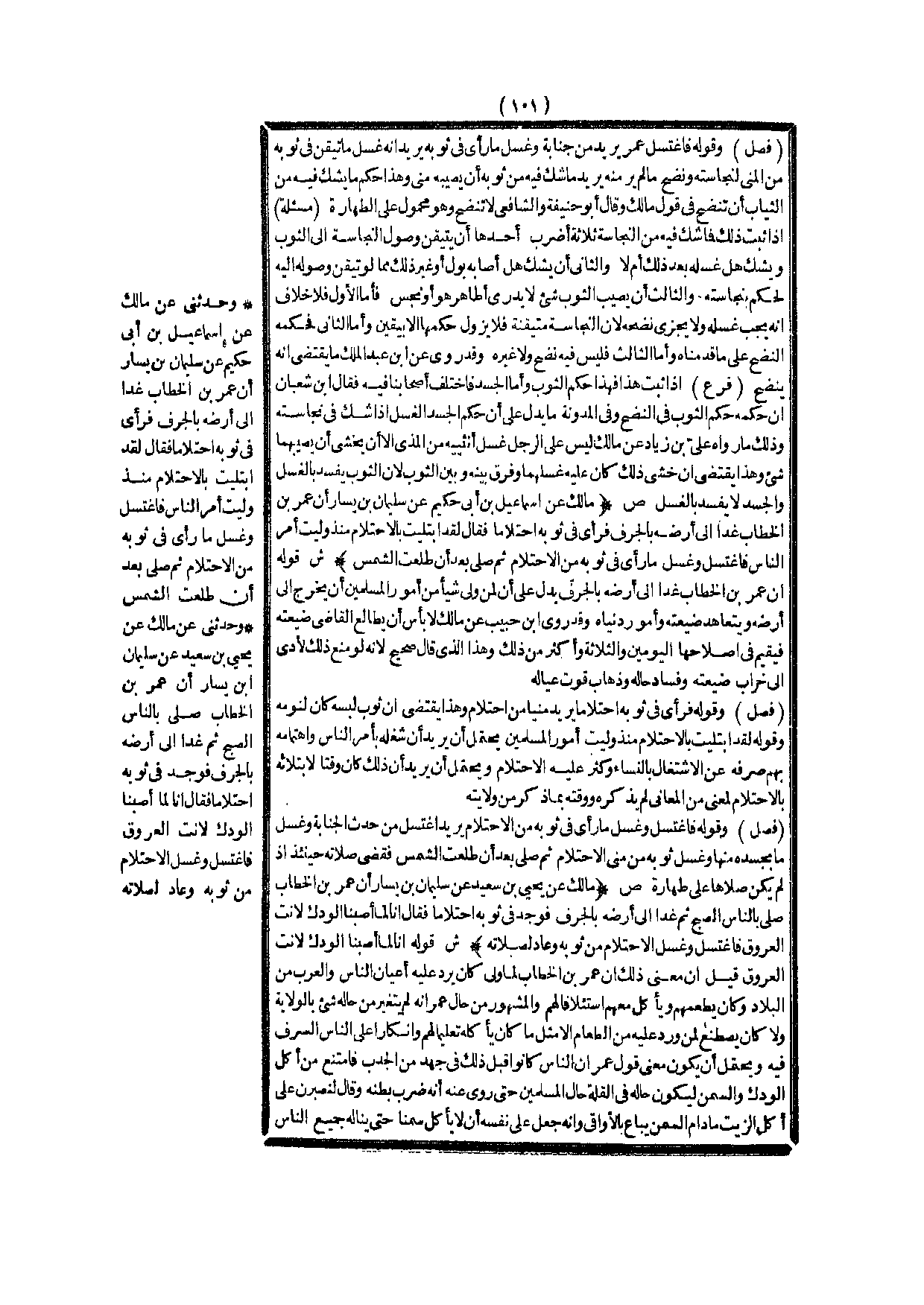(ص) : (مَالِكٌ عَنْ إسْمَاعِيلَ بْنِ أَبِي حَكِيمٍ عَنْ سُلَيْمَانَ بْنِ يَسَارٍ أَنَّ عُمَرَ بْنَ الْخَطَّابِ غَدَا إلَى أَرْضِهِ بِالْجَرْفِ فَرَأَى فِي ثَوْبِهِ احْتِلَامًا فَقَالَ لَقَدْ اُبْتُلِيتُ بِالِاحْتِلَامِ مُنْذُ وُلِّيت أَمْرَ النَّاسِ فَاغْتَسَلَ وَغَسَلَ مَا رَأَى فِي ثَوْبِهِ مِنْ الِاحْتِلَامِ ثُمَّ صَلَّى بَعْدَ أَنْ طَلَعَتْ الشَّمْسُ) .