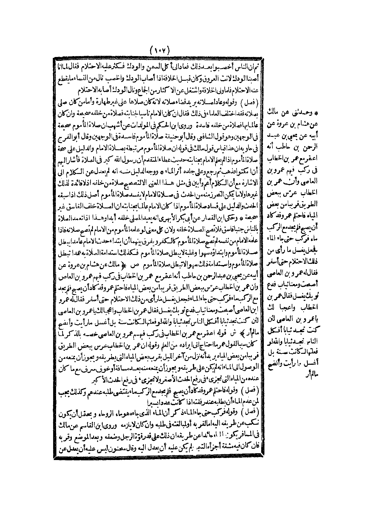 (ص) : (مَالِكٌ عَنْ هِشَامِ بْنِ عُرْوَةَ عَنْ أَبِيهِ عَنْ يَحْيَى بْنِ عَبْدِ الرَّحْمَنِ بْنِ حَاطِبٍ أَنَّهُ اعْتَمَرَ مَعَ عُمَرَ بْنِ الْخَطَّابِ فِي رَكْبٍ فِيهِمْ عَمْرُو بْنُ الْعَاصِ وَأَنَّ عُمَرَ بْنَ الْخَطَّابِ عَرَّسَ بِبَعْضِ الطَّرِيقِ قَرِيبًا مِنْ بَعْضِ الْمِيَاهِ فَاحْتَلَمَ عُمَرُ وَقَدْ كَادَ أَنْ يُصْبِحَ فَلَمْ يَجِدْ مَعَ الرَّكْبِ مَاءً فَرَكِبَ حَتَّى جَاءَ الْمَاءُ فَجَعَلَ يَغْسِلُ مَا رَأَى مِنْ ذَلِكَ الِاحْتِلَامِ حَتَّى أَسْفَرَ فَقَالَ لَهُ عَمْرُو بْنُ الْعَاصِ أَصْبَحْت وَمَعَنَا ثِيَابٌ فَدَعْ ثَوْبَك يُغْسَلُ فَقَالَ عُمَرُ بْنُ الْخَطَّابِ وَاعَجَبًا لَك يَا عَمْرَو بْنَ الْعَاصِ لَئِنْ كُنْت تَجِدُ ثِيَابًا أَفَكُلُّ النَّاسِ تَجِدُ ثِيَابًا وَاَللَّهِ لَوْ فَعَلْتهَا لَكَانَتْ سُنَّةً بَلْ أَغْسِلُ مَا رَأَيْت وَأَنْضَحُ مَا لَمْ أَرَ) .