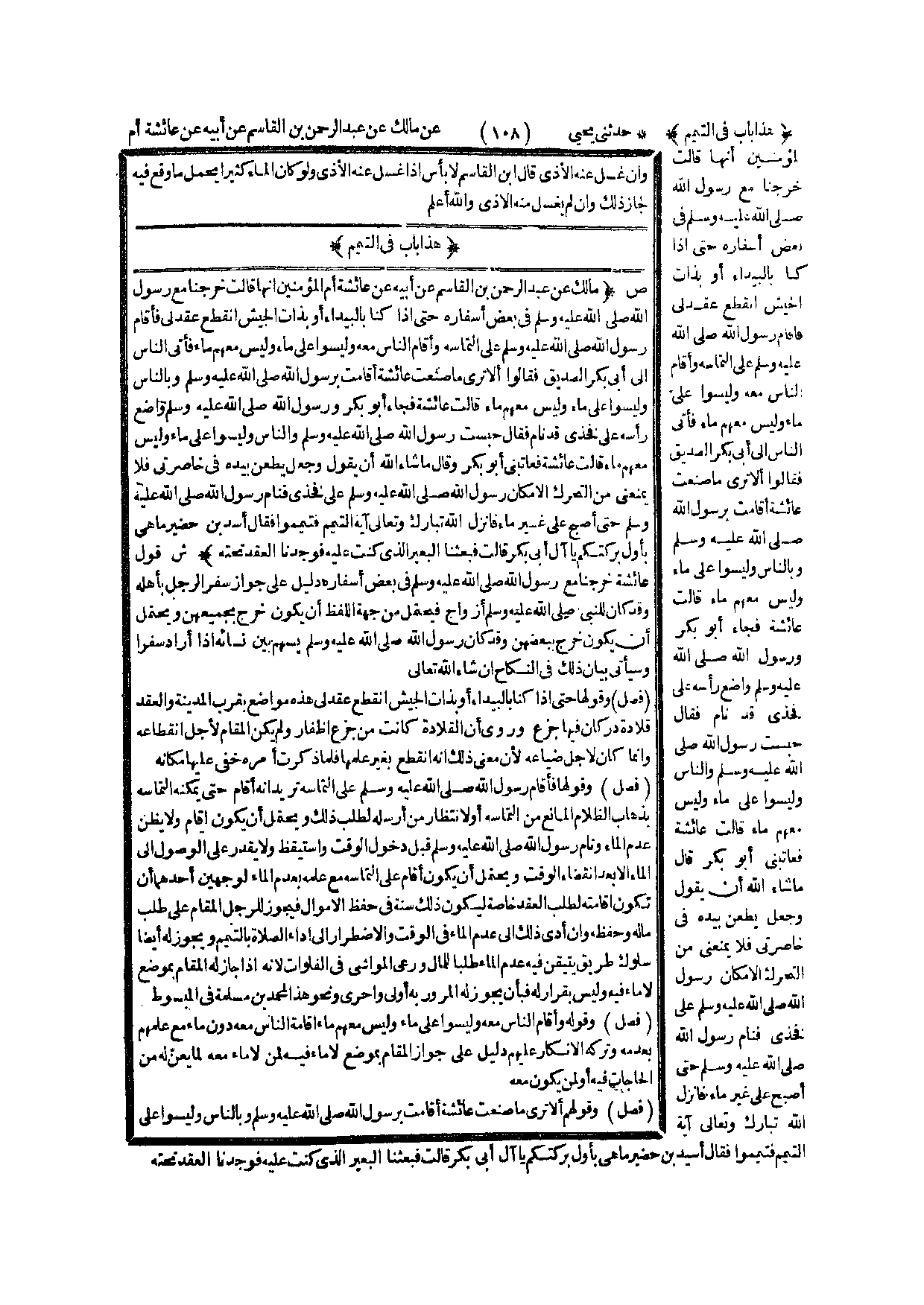 هَذَا بَابٌ فِي التَّيَمُّمِ (ص) : (مَالِكٌ عَنْ عَبْدِ الرَّحْمَنِ بْنِ الْقَاسِمِ عَنْ أَبِيهِ عَنْ «عَائِشَةَ أُمِّ الْمُؤْمِنِينَ أَنَّهَا قَالَتْ خَرَجْنَا مَعَ رَسُولِ - صَلَّى اللَّهُ عَلَيْهِ وَسَلَّمَ - فِي بَعْضِ أَسْفَارِهِ حَتَّى إذَا كُنَّا بِالْبَيْدَاءِ أَوْ بِذَاتِ الْجَيْشِ انْقَطَعَ عِقْدٌ لِي فَأَقَامَ رَسُولُ اللَّهِ - صَلَّى اللَّهُ عَلَيْهِ وَسَلَّمَ - عَلَى الْتِمَاسِهِ وَأَقَامَ النَّاسُ مَعَهُ وَلَيْسُوا عَلَى مَاءٍ وَلَيْسَ مَعَهُمْ مَاءٌ فَأَتَى النَّاسُ إلَى أَبِي بَكْرٍ الصِّدِّيقِ فَقَالُوا أَلَا تَرَى مَا صَنَعَتْ عَائِشَةُ أَقَامَتْ بِرَسُولِ اللَّهِ - صَلَّى اللَّهُ عَلَيْهِ وَسَلَّمَ - وَبِالنَّاسِ وَلَيْسُوا عَلَى مَاءٍ وَلَيْسَ مَعَهُمْ مَاءٌ قَالَتْ عَائِشَةُ فَجَاءَ أَبُو بَكْرٍ وَرَسُولُ اللَّهِ - صَلَّى اللَّهُ عَلَيْهِ وَسَلَّمَ - وَاضِعٌ رَأْسَهُ عَلَى فَخِذِي قَدْ نَامَ فَقَالَ حَبَسْت رَسُولَ اللَّهِ - صَلَّى اللَّهُ عَلَيْهِ وَسَلَّمَ - وَالنَّاسَ وَلَيْسُوا عَلَى مَاءٍ وَلَيْسَ مَعَهُمْ مَاءٌ قَالَتْ عَائِشَةُ فَعَاتَبَنِي أَبُو بَكْرٍ وَقَالَ مَا شَاءَ اللَّهُ أَنْ يَقُولَ وَجَعَلَ يَطْعَنُ بِيَدِهِ فِي خَاصِرَتِي فَلَا يَمْنَعُنِي مِنْ التَّحَرُّكِ إلَّا مَكَانُ رَسُولِ اللَّهِ - صَلَّى اللَّهُ عَلَيْهِ وَسَلَّمَ - عَلَى فَخِذِي فَنَامَ رَسُولُ اللَّهِ - صَلَّى اللَّهُ عَلَيْهِ وَسَلَّمَ - حَتَّى أَصْبَحَ عَلَى غَيْرِ مَاءٍ فَأَنْزَلَ اللَّهُ تَبَارَكَ وَتَعَالَى آيَةَ التَّيَمُّمِ فَتَيَمَّمُوا فَقَالَ أُسَيْدَ بْنُ حُضَيْرٍ مَا هِيَ بِأَوَّلِ بَرَكَتِكُمْ يَا آلَ أَبِي بَكْرٍ قَالَتْ فَبَعَثْنَا الْبَعِيرَ الَّذِي كُنْت عَلَيْهِ فَوَجَدْنَا الْعِقْدَ تَحْتَهُ» ) .