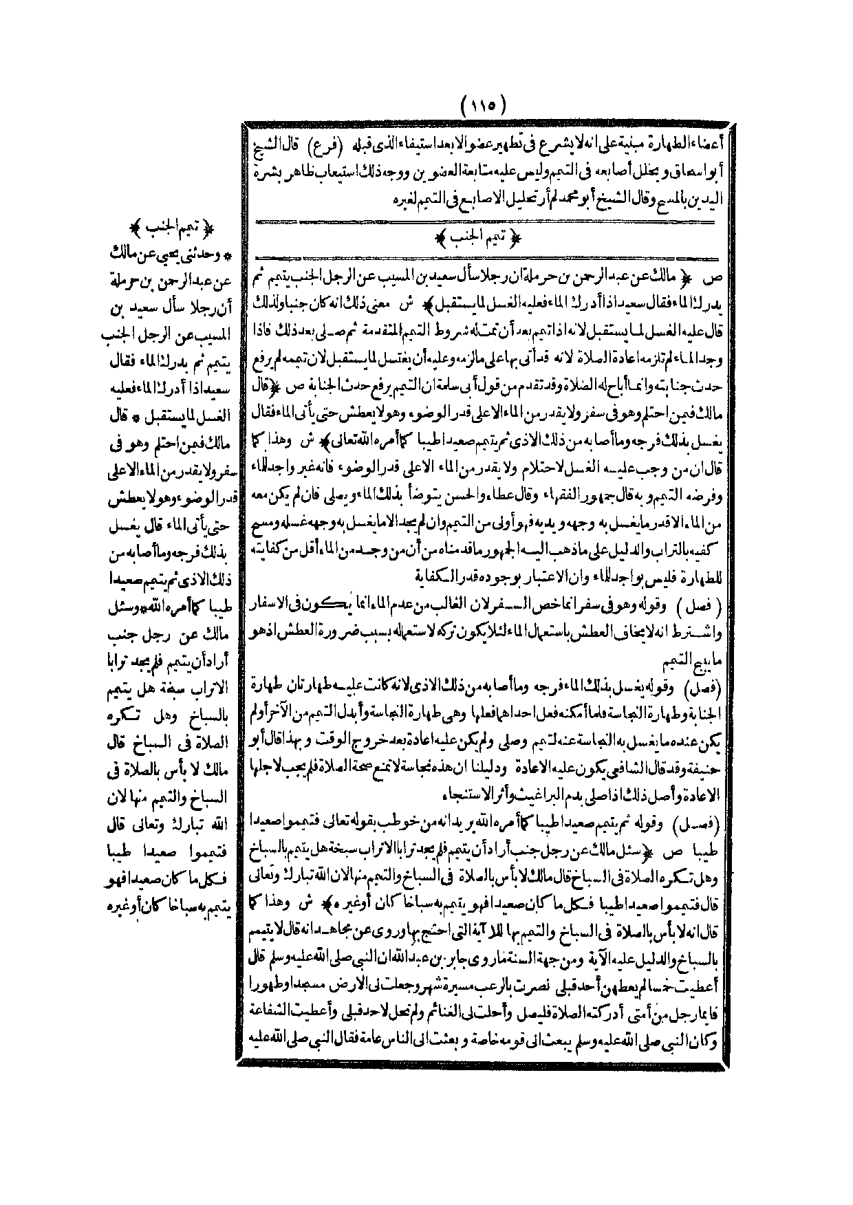 تَيَمُّمُ الْجُنُبِ (ص) : (مَالِكٌ عَنْ عَبْدِ الرَّحْمَنِ بْنِ حَرْمَلَةَ أَنَّ رَجُلًا سَأَلَ سَعِيدَ بْنَ الْمُسَيِّبِ عَنْ الرَّجُلِ الْجُنُبِ يَتَيَمَّمُ ثُمَّ يُدْرِكُ الْمَاءَ فَقَالَ سَعِيدٌ إذَا أَدْرَكَ الْمَاءَ فَعَلَيْهِ الْغُسْلُ لِمَا يُسْتَقْبَلُ) .