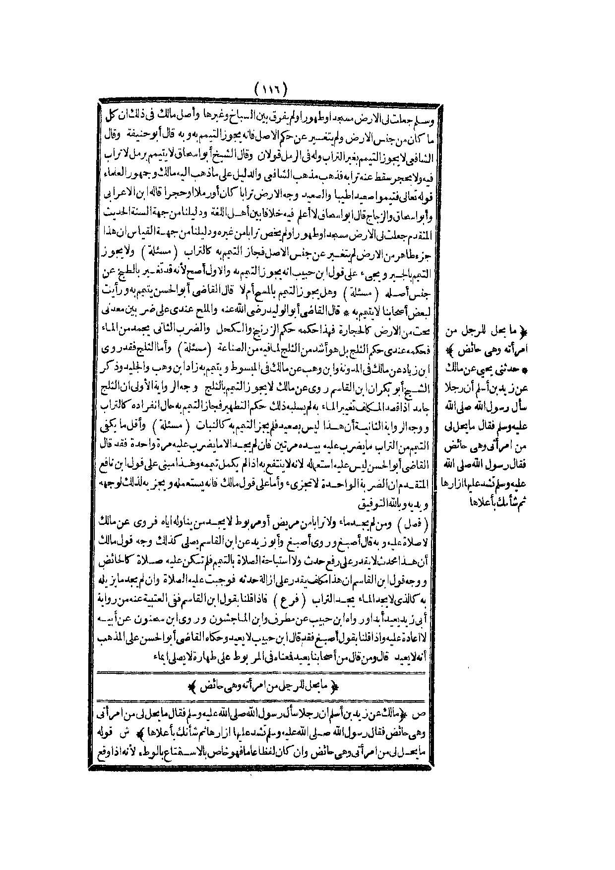 مَا يَحِلُّ لِلرَّجُلِ مِنْ امْرَأَتِهِ وَهِيَ حَائِضٌ (ص) : (مَالِكٌ عَنْ زَيْدِ بْنِ أَسْلَمَ «أَنَّ رَجُلًا سَأَلَ رَسُولَ اللَّهِ - صَلَّى اللَّهُ عَلَيْهِ وَسَلَّمَ - فَقَالَ مَا يَحِلُّ لِي مِنْ امْرَأَتِي وَهِيَ حَائِضٌ فَقَالَ رَسُولُ اللَّهِ - صَلَّى اللَّهُ عَلَيْهِ وَسَلَّمَ - لِتَشُدَّ عَلَيْهَا إزَارَهَا ثُمَّ شَأْنَك بِأَعْلَاهَا» ) .