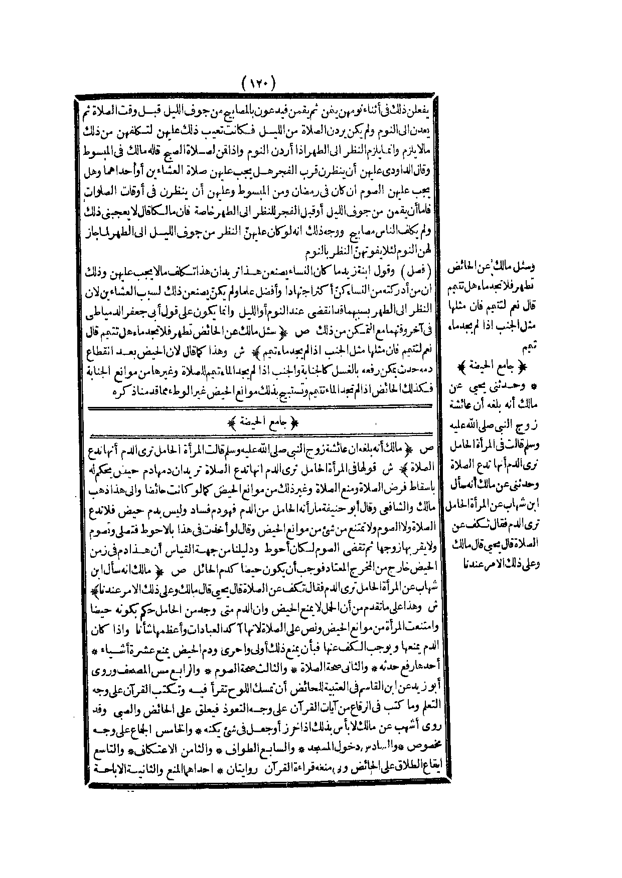 جَامِعُ الْحَيْضَةِ (ص) : (مَالِكٌ أَنَّهُ بَلَغَهُ أَنَّ عَائِشَةَ زَوْجَ النَّبِيِّ - صَلَّى اللَّهُ عَلَيْهِ وَسَلَّمَ - قَالَتْ الْمَرْأَةُ الْحَامِلُ تَرَى الدَّمَ أَنَّهَا تَدَعُ الصَّلَاةَ) .