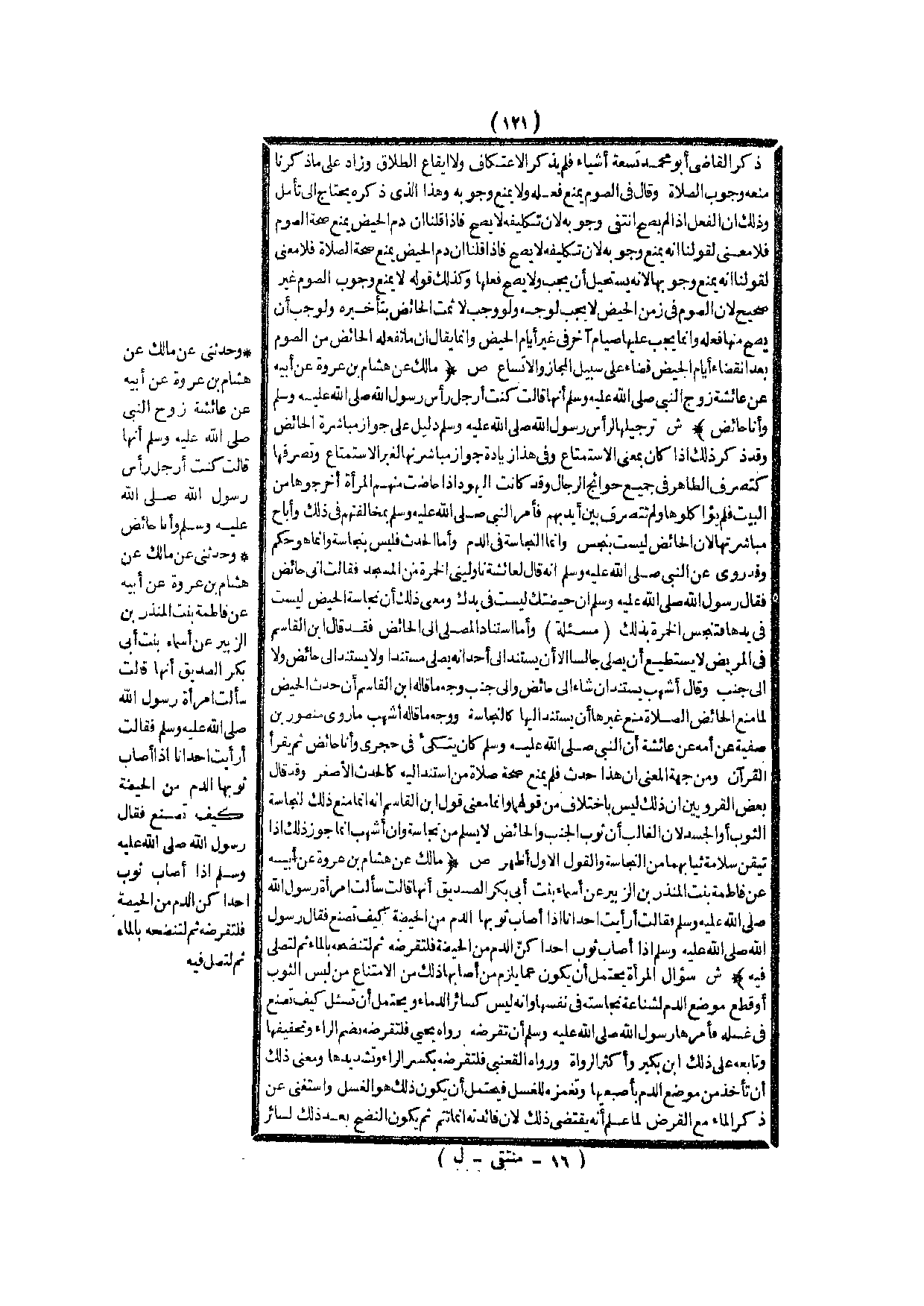 (ص) : (مَالِكٌ عَنْ هِشَامِ بْنِ عُرْوَةَ عَنْ أَبِيهِ عَنْ «عَائِشَةَ زَوْجِ النَّبِيِّ - صَلَّى اللَّهُ عَلَيْهِ وَسَلَّمَ - أَنَّهَا قَالَتْ كُنْت أُرَجِّلُ رَأْسَ رَسُولِ اللَّهِ - صَلَّى اللَّهُ عَلَيْهِ وَسَلَّمَ - وَأَنَا حَائِضٌ» ) .