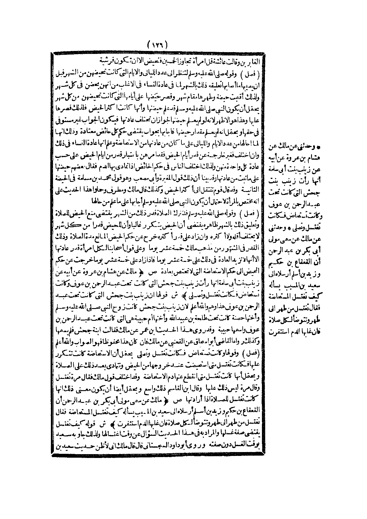 (ص) : (مَالِكٌ عَنْ هِشَامِ بْنِ عُرْوَةَ عَنْ أَبِيهِ عَنْ زَيْنَبَ بِنْتِ أَبِي سَلَمَةَ أَنَّهَا رَأَتْ زَيْنَبَ بِنْتَ جَحْشٍ الَّتِي كَانَتْ تَحْتَ عَبْدِ الرَّحْمَنِ بْنِ عَوْفٍ وكَانَتْ تُسْتَحَاضُ فَكَانَتْ تَغْتَسِلُ وَتُصَلِّي)