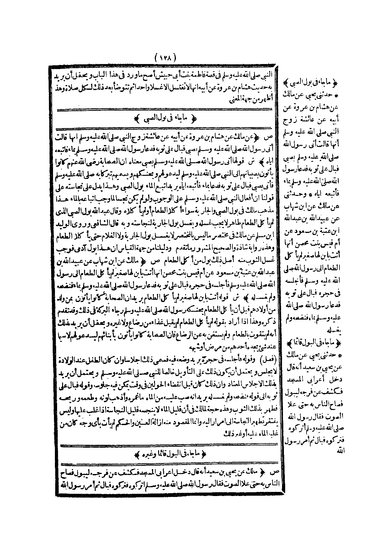 (ص) : (مَالِكٌ عَنْ ابْنِ شِهَابٍ عَنْ عُبَيْدِ اللَّهِ بْنِ عَبْدِ اللَّهِ بْنِ عُتْبَةَ بْنِ مَسْعُودٍ عَنْ أُمِّ قَيْسِ بِنْتِ مُحْصِنٍ «أَنَّهَا أَتَتْ بِابْنٍ لَهَا صَغِيرٍ لَمْ يَأْكُلْ الطَّعَامَ إلَى رَسُولِ اللَّهِ - صَلَّى اللَّهُ عَلَيْهِ وَسَلَّمَ - فَأَجْلَسَهُ فِي حِجْرِهِ فَبَالَ عَلَى ثَوْبِهِ فَدَعَا رَسُولُ اللَّهِ - صَلَّى اللَّهُ عَلَيْهِ وَسَلَّمَ - بِمَاءٍ فَنَضَحَهُ وَلَمْ يَغْسِلْهُ» ) .