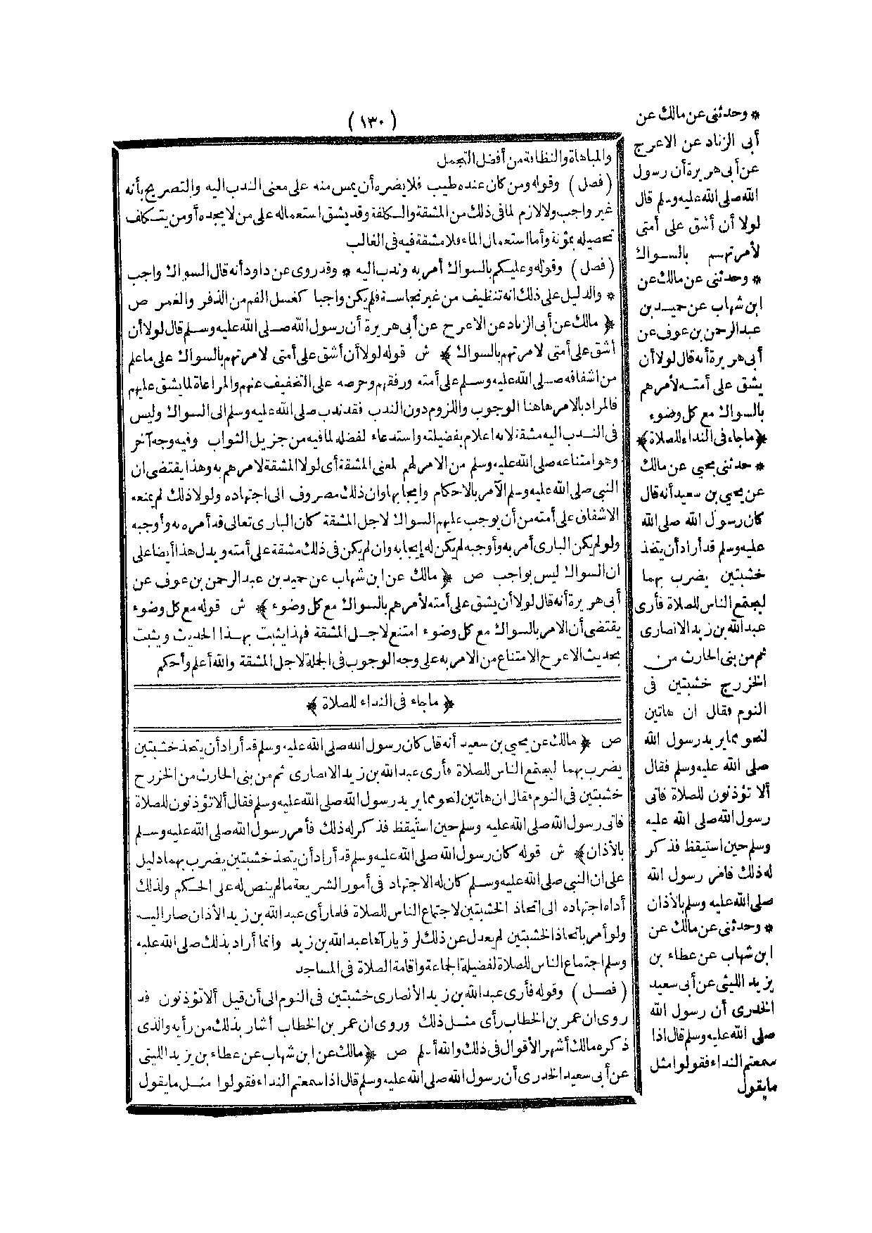 (ص) : (مَالِكٌ عَنْ أَبِي الزِّنَادِ عَنْ الْأَعْرَجِ عَنْ أَبِي هُرَيْرَةَ أَنَّ رَسُولَ اللَّهِ - صَلَّى اللَّهُ عَلَيْهِ وَسَلَّمَ - قَالَ «لَوْلَا أَنْ أَشُقَّ عَلَى أُمَّتِي لَأَمَرْتُهُمْ بِالسِّوَاكِ» ) .
