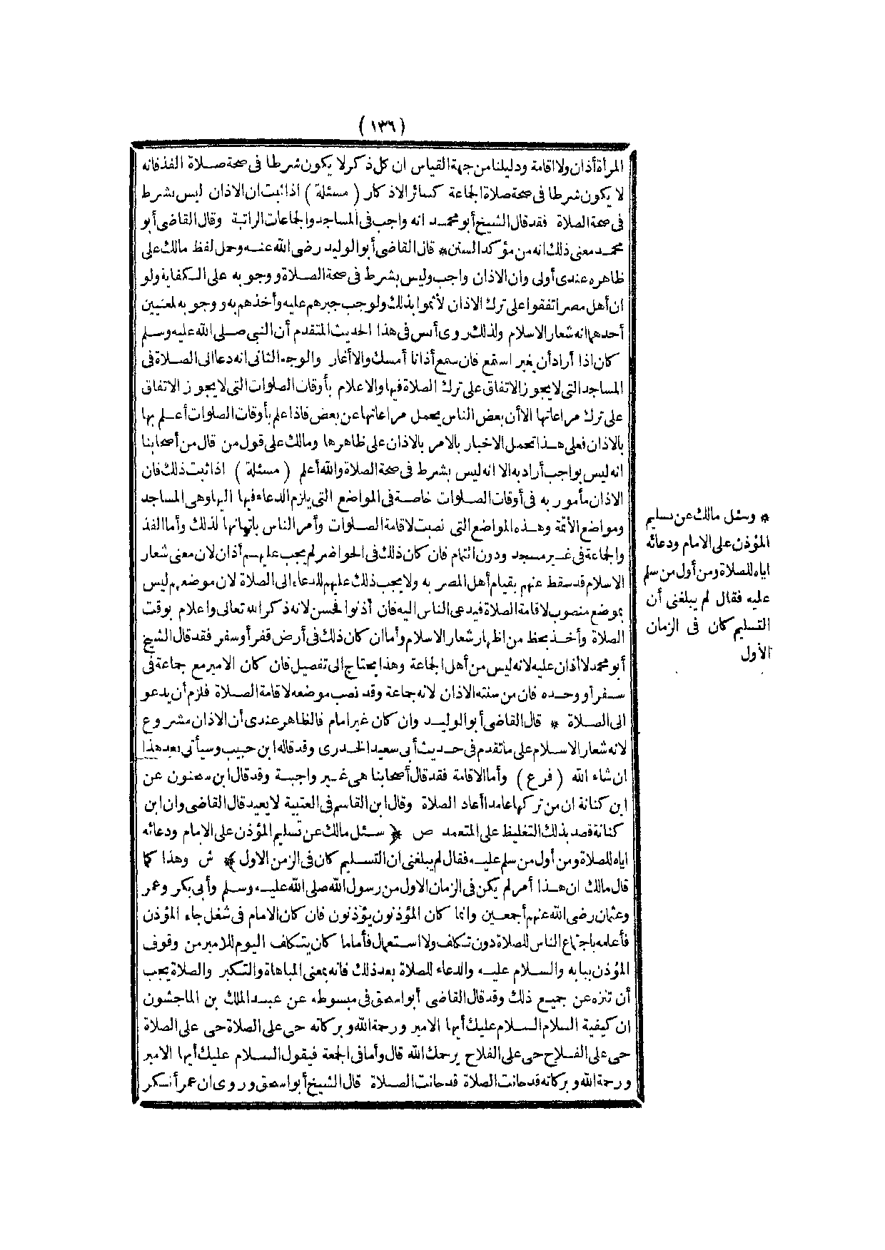 (ص) : (سُئِلَ مَالِكٌ عَنْ تَسْلِيمِ الْمُؤَذِّنِ عَلَى الْإِمَامِ وَدُعَائِهِ إيَّاهُ لِلصَّلَاةِ وَمَنْ أَوَّلُ مَنْ سَلَّمَ عَلَيْهِ فَقَالَ لَمْ يَبْلُغْنِي أَنَّ التَّسْلِيمَ كَانَ فِي الزَّمَنِ الْأَوَّلِ) .