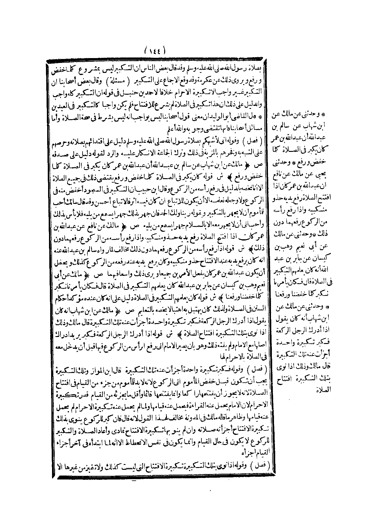 (ص) : (مَالِكٌ عَنْ ابْنِ شِهَابٍ عَنْ سَالِمِ بْنِ عَبْدِ اللَّهِ أَنَّ عَبْدَ اللَّهِ بْنَ عُمَرَ كَانَ يُكَبِّرُ فِي الصَّلَاةِ كُلَّمَا خَفَضَ وَرَفَعَ) .