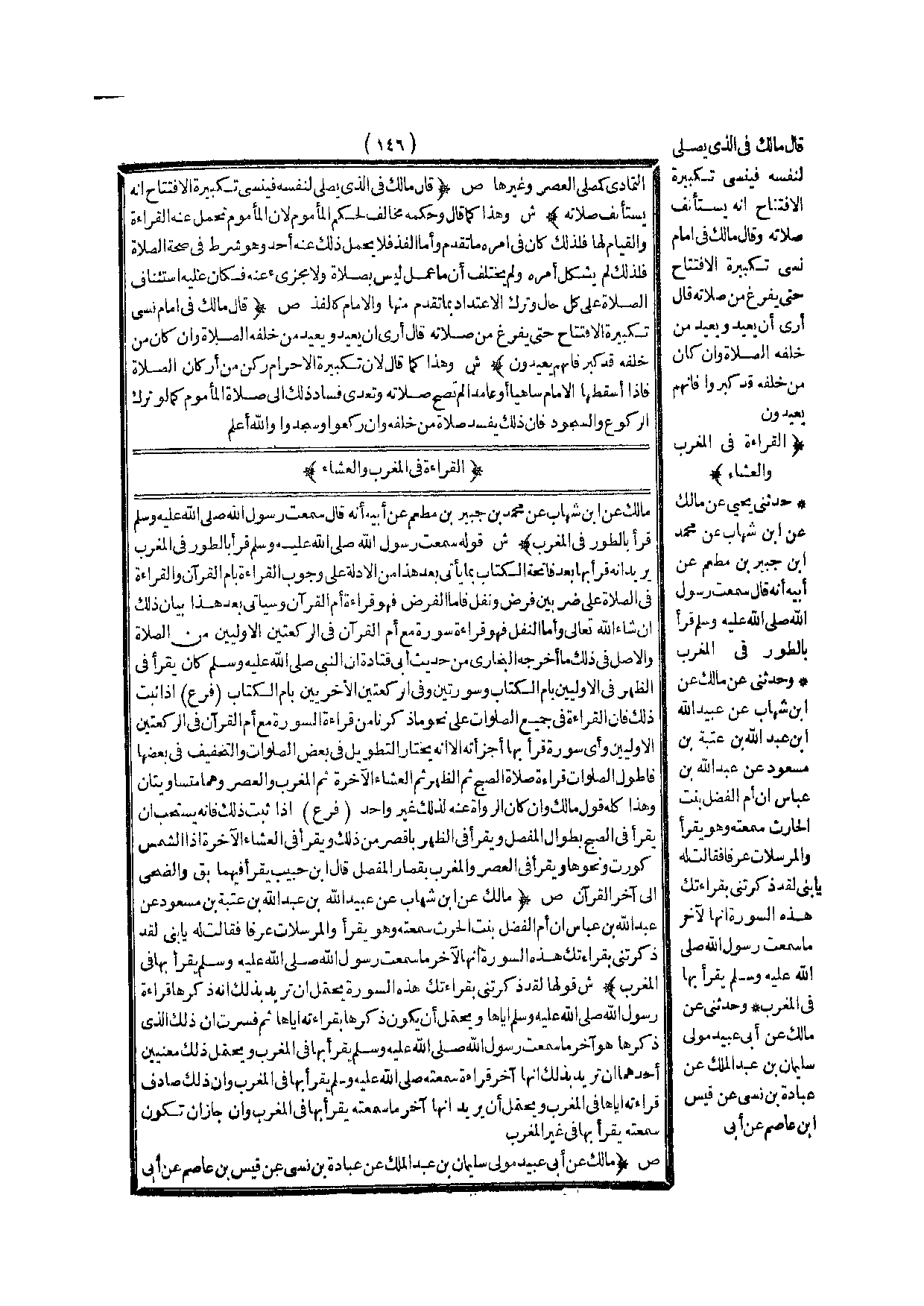 الْقِرَاءَةُ فِي الْمَغْرِبِ وَالْعِشَاءِ (ص) : (مَالِكٌ عَنْ ابْنِ شِهَابٍ عَنْ مُحَمَّدِ بْنِ جُبَيْرِ بْنِ مُطْعِمٍ عَنْ أَبِيهِ أَنَّهُ قَالَ «سَمِعْت رَسُولَ اللَّهِ - صَلَّى اللَّهُ عَلَيْهِ وَسَلَّمَ - قَرَأَ بِالطُّورِ فِي الْمَغْرِبِ» ) (ص) : (مَالِكٌ عَنْ أَبِي عُبَيْدِ مَوْلَى سُلَيْمَانَ بْنِ عَبْدِ الْمَلِكِ عَنْ عُبَادَةَ بْنِ نَسِيٍّ عَنْ قَيْسِ بْنِ عَاصِمٍ عَنْ أَبِي عَبْدِ اللَّهِ الصُّنَابِحِيِّ