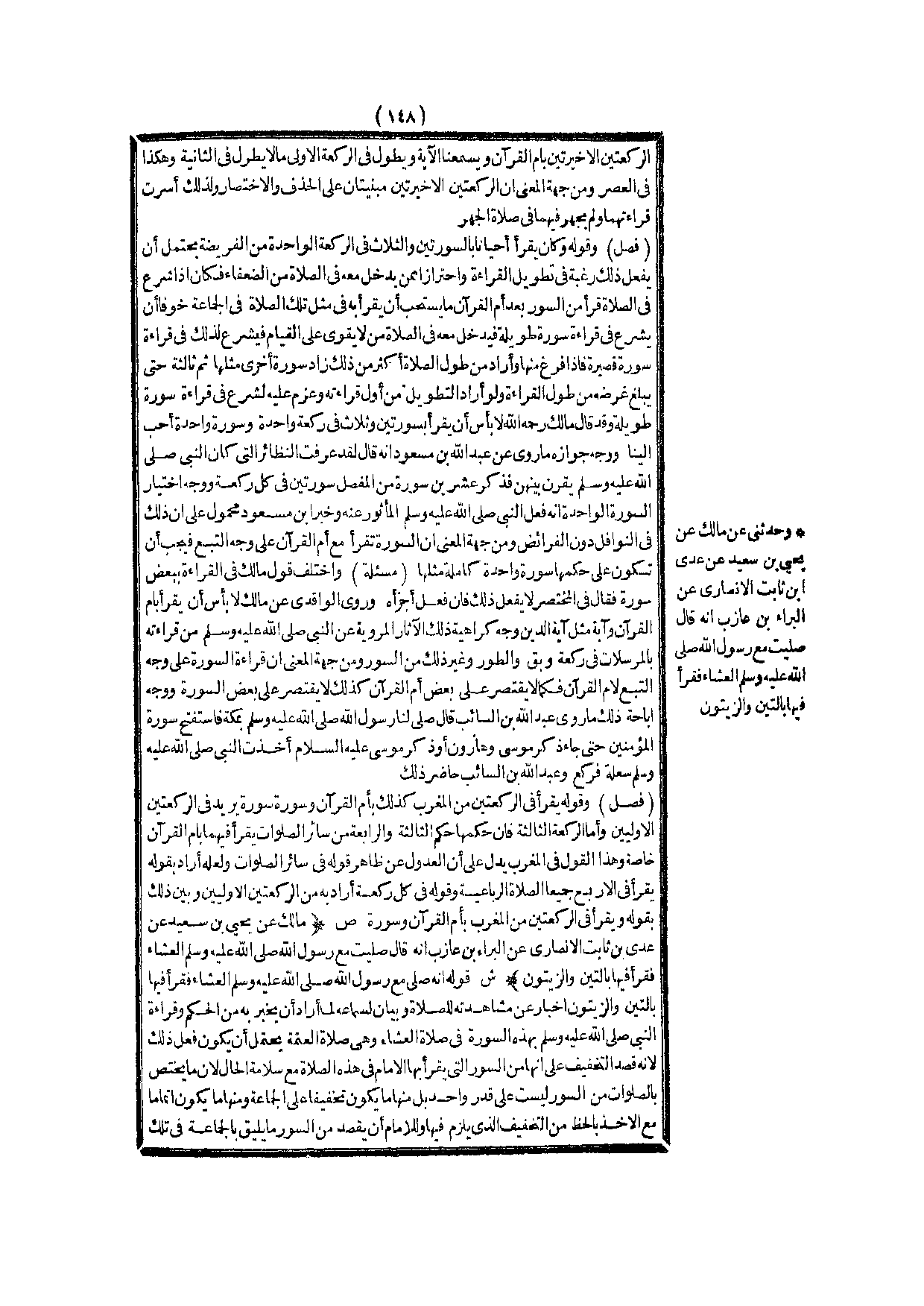 (ص) : (مَالِكٌ عَنْ يَحْيَى بْنِ سَعِيدٍ عَنْ عَدِيِّ بْنِ ثَابِتِ الْأَنْصَارِيِّ عَنْ «الْبَرَاءِ بْنِ عَازِبٍ أَنَّهُ قَالَ صَلَّيْت مَعَ رَسُولِ اللَّهِ - صَلَّى اللَّهُ عَلَيْهِ وَسَلَّمَ - الْعِشَاءَ فَقَرَأَ فِيهَا بِالتِّينِ وَالزَّيْتُونِ» ) .
