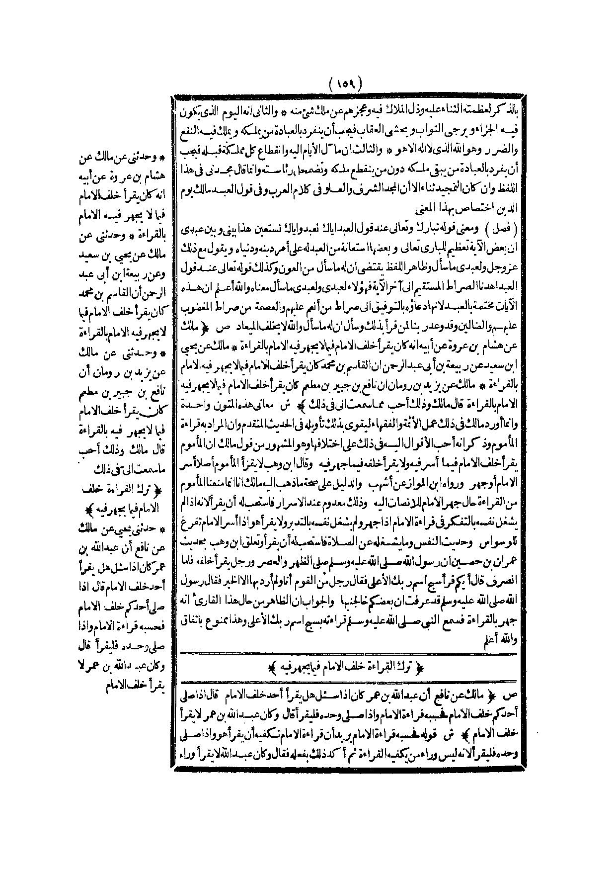 تَرْكُ الْقِرَاءَةِ خَلْفَ الْإِمَامِ فِيمَا يَجْهَرُ فِيهِ (ص) : (مَالِكٌ عَنْ نَافِعٍ أَنَّ عَبْدَ اللَّهِ بْنَ عُمَرَ كَانَ إذَا سَأَلَ هَلْ يَقْرَأُ أَحَدٌ خَلْفَ الْإِمَامِ قَالَ إذَا صَلَّى أَحَدُكُمْ خَلْفَ الْإِمَامِ فَحَسْبُهُ قِرَاءَةُ الْإِمَامِ وَإِذَا صَلَّى وَحْدَهُ فَلْيَقْرَأْ قَالَ وَكَانَ عَبْدُ اللَّهِ بْنُ عُمَرَ لَا يَقْرَأُ خَلْفَ الْإِمَامِ)