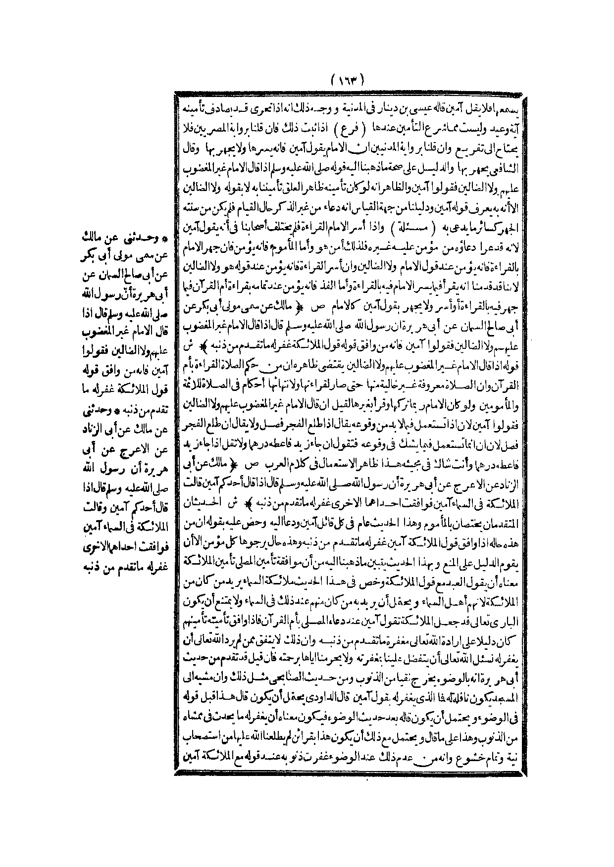 (ص) : (مَالِكٌ عَنْ أَبِي الزِّنَادِ عَنْ الْأَعْرَجِ عَنْ أَبِي هُرَيْرَةَ أَنَّ رَسُولَ اللَّهِ - صَلَّى اللَّهُ عَلَيْهِ وَسَلَّمَ - قَالَ «إذَا قَالَ أَحَدُكُمْ آمِينَ قَالَتْ الْمَلَائِكَةُ فِي السَّمَاءِ آمِينَ فَوَافَقَتْ إحْدَاهُمَا الْأُخْرَى غُفِرَ لَهُ مَا تَقَدَّمَ مِنْ ذَنْبِهِ» ) .