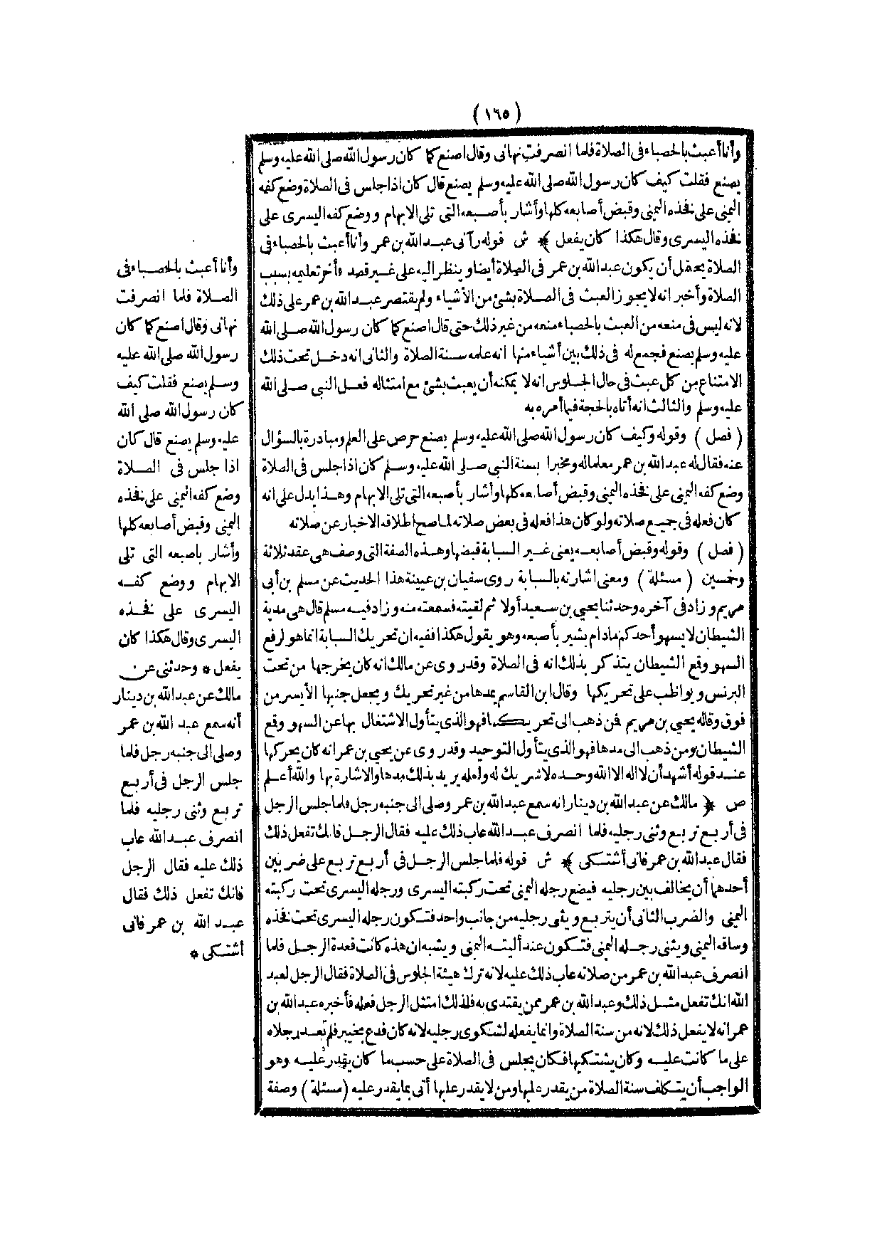 فَلَمَّا انْصَرَفَ عَبْدُ اللَّهِ بْنُ عُمَرَ مِنْ صَلَاتِهِ عَابَ ذَلِكَ عَلَيْهِ لِأَنَّهُ تَرَكَ هَيْئَةَ الْجُلُوسِ فِي الصَّلَاةِ فَقَالَ الرَّجُلُ لِعَبْدِ اللَّهِ إنَّك تَفْعَلُ مِثْلَ ذَلِكَ وَعَبْدُ اللَّهِ بْنُ عُمَرَ مِمَّنْ يُقْتَدَى بِهِ فَلِذَلِكَ امْتَثَلَ الرَّجُلُ فِعْلَهُ فَأَخْبَرَهُ عَبْدُ اللَّهِ بْنُ عُمَرَ أَنَّهُ لَا يَفْعَلُ ذَلِكَ لِأَنَّهُ مِنْ سُنَّةِ الصَّلَاةِ وَإِنَّمَا يَفْعَلُهُ لِشَكْوَى رِجْلَيْهِ لِأَنَّهُ كَانَ فُدِعَ بِخَيْبَرَ فَلَمْ تَعُدْ رِجْلَاهُ عَلَى مَا كَانَتْ عَلَيْهِ وَكَانَ يَشْتَكِيهَا فَكَانَ يَجْلِسُ فِي الصَّلَاةِ عَلَى حَسَبِ مَا كَانَ يَقْدِرُ عَلَيْهِ وَهُوَ الْوَاجِبُ أَنْ يَتَكَلَّفَ سُنَّةَ الصَّلَاةِ مَنْ يَقْدِرُ عَلَيْهَا وَمَنْ لَا يَقْدِرُ عَلَيْهَا أَتَى بِمَا يَقْدِرُ عَلَيْهِ.