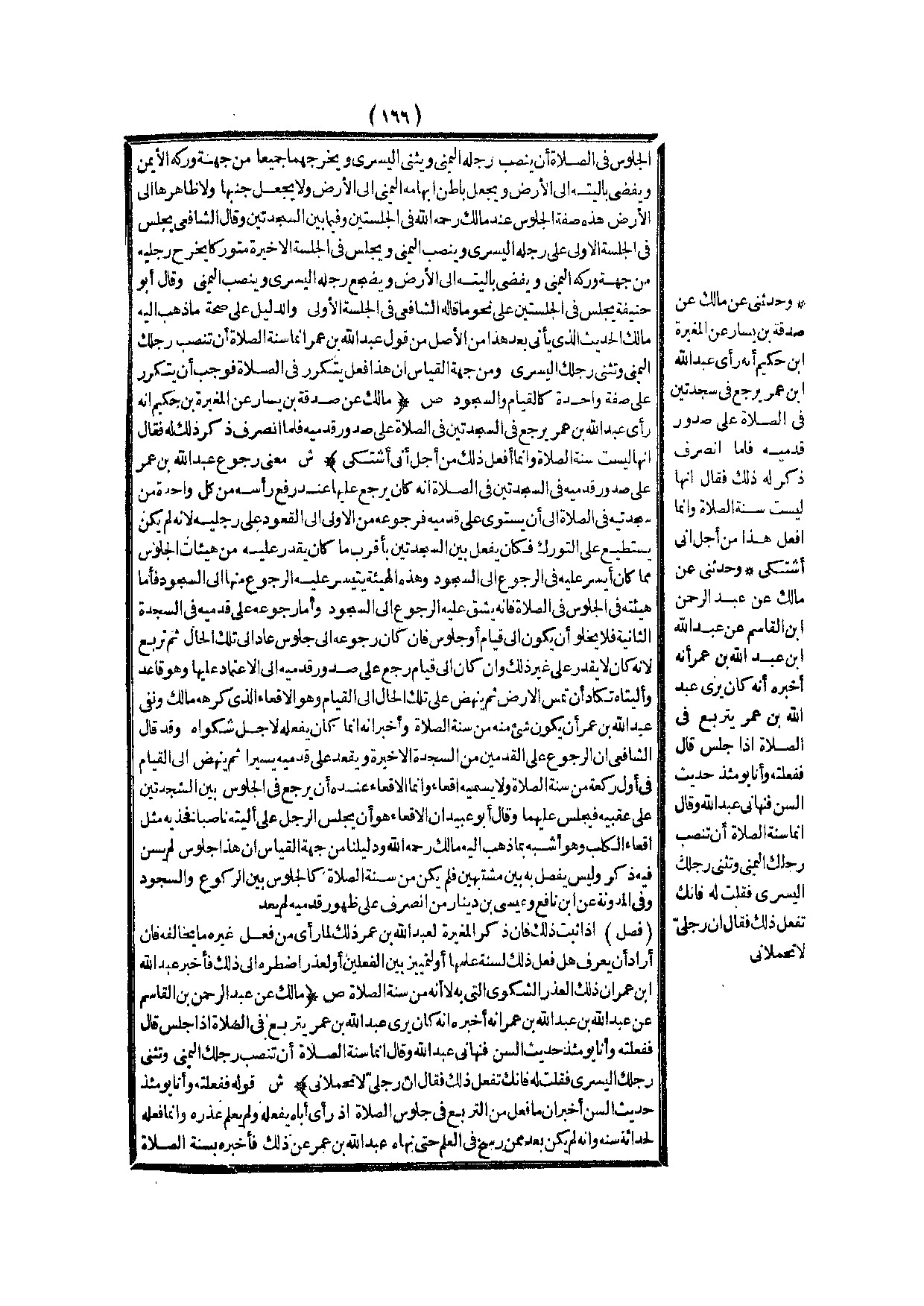 (ص) : (مَالِكٌ عَنْ صَدَقَةَ بْنِ يَسَارٍ عَنْ الْمُغِيرَةِ بْنِ حَكِيمٍ أَنَّهُ رَأَى عَبْدَ اللَّهِ بْنَ عُمَرَ يَرْجِعُ فِي السَّجْدَتَيْنِ فِي الصَّلَاةِ عَلَى صُدُورِ قَدَمَيْهِ فَلَمَّا انْصَرَفَ ذَكَرَ ذَلِكَ لَهُ فَقَالَ إنَّهَا لَيْسَتْ سُنَّةَ الصَّلَاةِ وَإِنَّمَا أَفْعَلُ ذَلِكَ مِنْ أَجْلِ أَنِّي أَشْتَكِي)