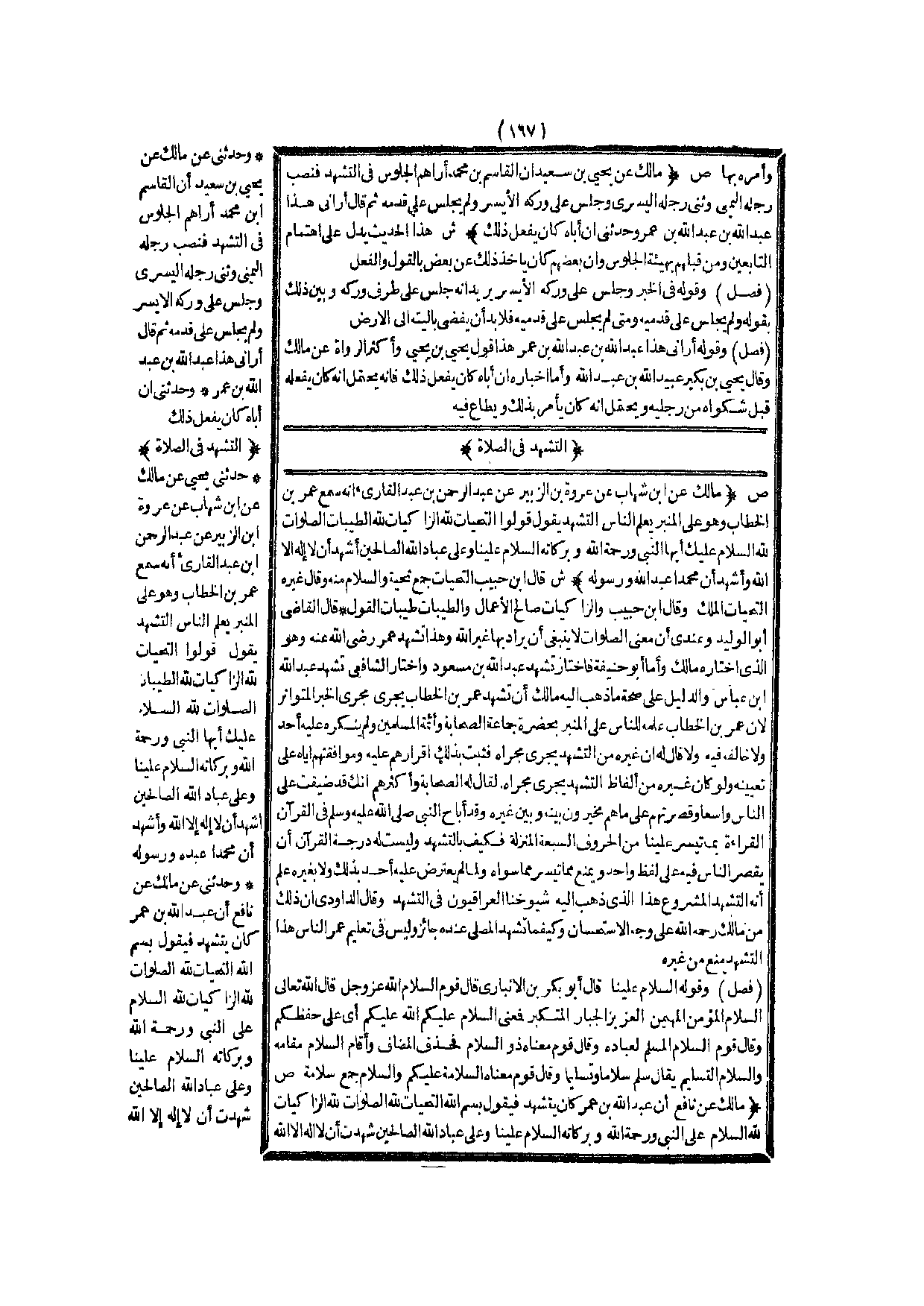 (ص) : (مَالِكٌ عَنْ يَحْيَى بْنِ سَعِيدٍ أَنَّ الْقَاسِمَ بْنَ مُحَمَّدٍ أَرَاهُمْ الْجُلُوسَ فِي التَّشَهُّدِ فَنَصَبَ رِجْلَهُ الْيُمْنَى وَثَنَى رِجْلَهُ الْيُسْرَى وَجَلَسَ عَلَى وَرِكِهِ الْأَيْسَرِ وَلَمْ يَجْلِسْ عَلَى قَدَمِهِ ثُمَّ قَالَ أَرَانِي هَذَا عَبْدُ اللَّهِ بْنُ عَبْدِ اللَّهِ بْنِ عُمَرَ وَحَدَّثَنِي أَنَّ أَبَاهُ كَانَ يَفْعَلُ ذَلِكَ) .