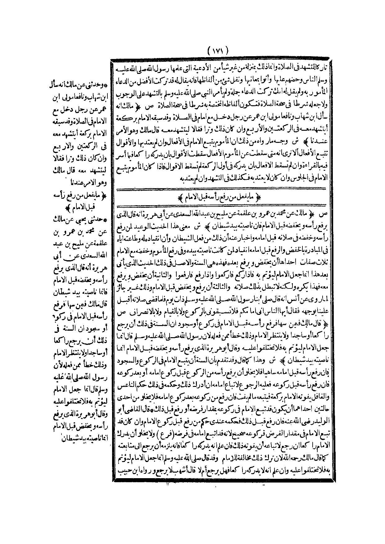 مَا يَفْعَلُ مَنْ رَفَعَ رَأْسَهُ قَبْلَ الْإِمَامِ (ص) : (مَالِكٌ عَنْ مُحَمَّدِ بْنِ عَمْرِو بْنِ عَلْقَمَةَ عَنْ مَلِيحِ بْنِ عَبْدِ اللَّهِ السَّعْدِيِّ عَنْ أَبِي هُرَيْرَةَ أَنَّهُ قَالَ الَّذِي يَرْفَعُ رَأْسَهُ وَيَخْفِضُهُ قَبْلَ الْإِمَامِ فَإِنَّ نَاصِيَتَهُ بِيَدِ شَيْطَانٍ) .