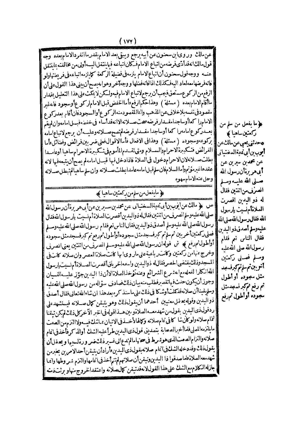 مَا يَفْعَلُ مَنْ سَلَّمَ مِنْ رَكْعَتَيْنِ سَاهِيًا (ص) : (مَالِكٌ عَنْ أَيُّوبَ بْنِ أَبِي تَمِيمَةَ السِّخْتِيَانِيُّ عَنْ مُحَمَّدِ بْنِ سِيرِينَ عَنْ أَبِي هُرَيْرَةَ «أَنَّ رَسُولَ اللَّهِ - صَلَّى اللَّهُ عَلَيْهِ وَسَلَّمَ - انْصَرَفَ مِنْ اثْنَتَيْنِ فَقَالَ لَهُ ذُو الْيَدَيْنِ أَقَصُرَتْ الصَّلَاةُ أَمْ نَسِيتَ يَا رَسُولَ اللَّهِ فَقَالَ رَسُولُ اللَّهِ - صَلَّى اللَّهُ عَلَيْهِ وَسَلَّمَ - أَصَدَقَ ذُو الْيَدَيْنِ فَقَالَ النَّاسُ نَعَمْ فَقَامَ رَسُولُ اللَّهِ - صَلَّى اللَّهُ عَلَيْهِ وَسَلَّمَ - فَصَلَّى رَكْعَتَيْنِ أُخْرَيَيْنِ ثُمَّ سَلَّمَ ثُمَّ كَبَّرَ فَسَجَدَ مِثْلَ سُجُودِهِ أَوْ أَطْوَلَ ثُمَّ رَفَعَ ثُمَّ كَبَّرَ فَسَجَدَ مِثْلَ سُجُودِهِ أَوْ أَطْوَلَ ثُمَّ رَفَعَ» )