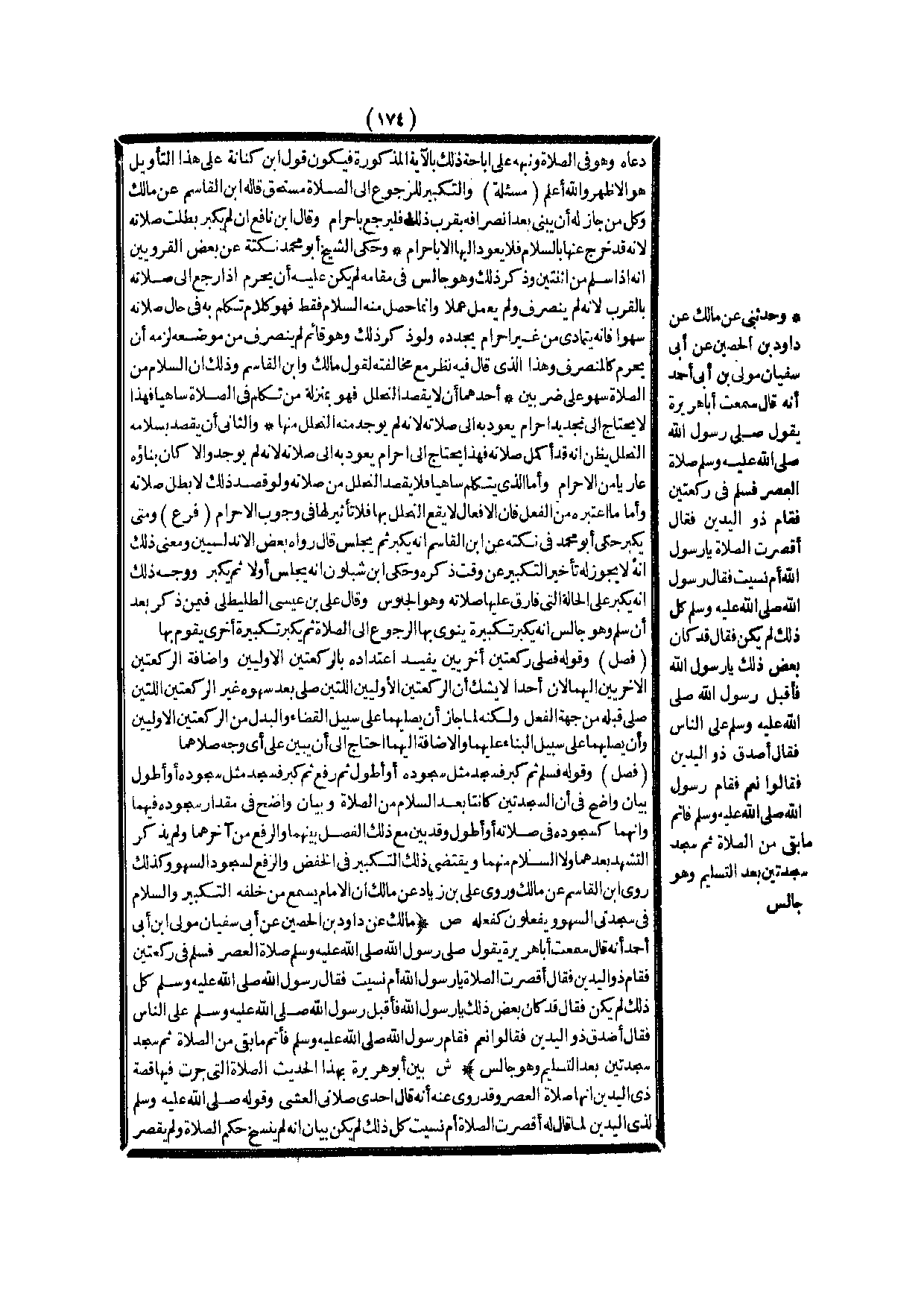 (ص) : (مَالِكٌ عَنْ دَاوُد بْنِ الْحُصَيْنِ عَنْ أَبِي سُفْيَانَ مَوْلَى ابْنِ أَبِي أَحْمَدَ أَنَّهُ قَالَ سَمِعْت أَبَا هُرَيْرَةَ يَقُولُ «صَلَّى رَسُولُ اللَّهِ - صَلَّى اللَّهُ عَلَيْهِ وَسَلَّمَ - صَلَاةَ الْعَصْرِ فَسَلَّمَ فِي رَكْعَتَيْنِ فَقَامَ ذُو الْيَدَيْنِ فَقَالَ أَقَصُرَتْ الصَّلَاةُ يَا رَسُولَ اللَّهِ أَمْ نَسِيتَ فَقَالَ رَسُولُ اللَّهِ - صَلَّى اللَّهُ عَلَيْهِ وَسَلَّمَ - كُلُّ ذَلِكَ لَمْ يَكُنْ فَقَالَ قَدْ كَانَ بَعْضُ ذَلِكَ يَا رَسُولَ اللَّهِ فَأَقْبَلَ رَسُولُ اللَّهِ - صَلَّى اللَّهُ عَلَيْهِ وَسَلَّمَ - عَلَى النَّاسِ فَقَالَ أَصَدَقَ ذُو الْيَدَيْنِ فَقَالُوا نَعَمْ فَقَامَ رَسُولُ اللَّهِ - صَلَّى اللَّهُ عَلَيْهِ وَسَلَّمَ - فَأَتَمَّ مَا بَقِيَ مِنْ الصَّلَاةِ ثُمَّ سَجَدَ سَجْدَتَيْنِ بَعْدَ التَّسْلِيمِ وَهُوَ جَالِسٌ» ) .