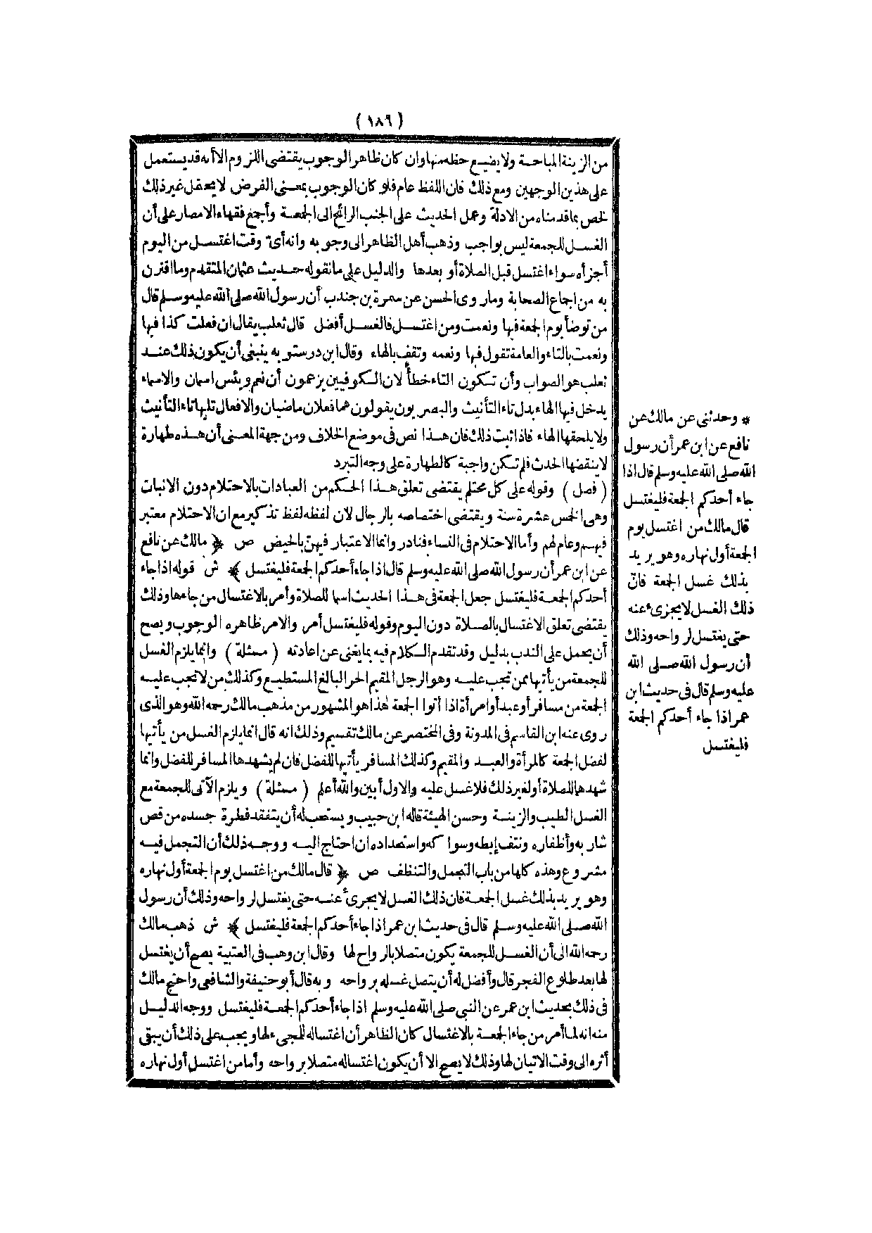 (ش) : ذَهَبَ مَالِكٌ - رَحِمَهُ اللَّهُ - إلَى أَنَّ الْغُسْلَ لِلْجُمُعَةِ يَكُونُ مُتَّصِلًا بِالرَّوَاحِ لَهَا وَقَالَ ابْنُ وَهْبٍ فِي الْعُتْبِيَّةِ يَصِحُّ أَنْ يَغْتَسِلَ لَهَا بَعْدَ طُلُوعِ الْفَجْرِ قَالَ وَأَفْضَلُ لَهُ أَنْ يَتَّصِلَ غُسْلُهُ بِرَوَاحِهِ وَبِهِ قَالَ أَبُو حَنِيفَةَ وَالشَّافِعِيُّ وَاحْتَجَّ مَالِكٌ فِي ذَلِكَ بِحَدِيثِ ابْنِ عُمَرَ عَنْ النَّبِيِّ - صَلَّى اللَّهُ عَلَيْهِ وَسَلَّمَ - «إذَا جَاءَ أَحَدُكُمْ الْجُمُعَةَ فَلْيَغْتَسِلْ» .