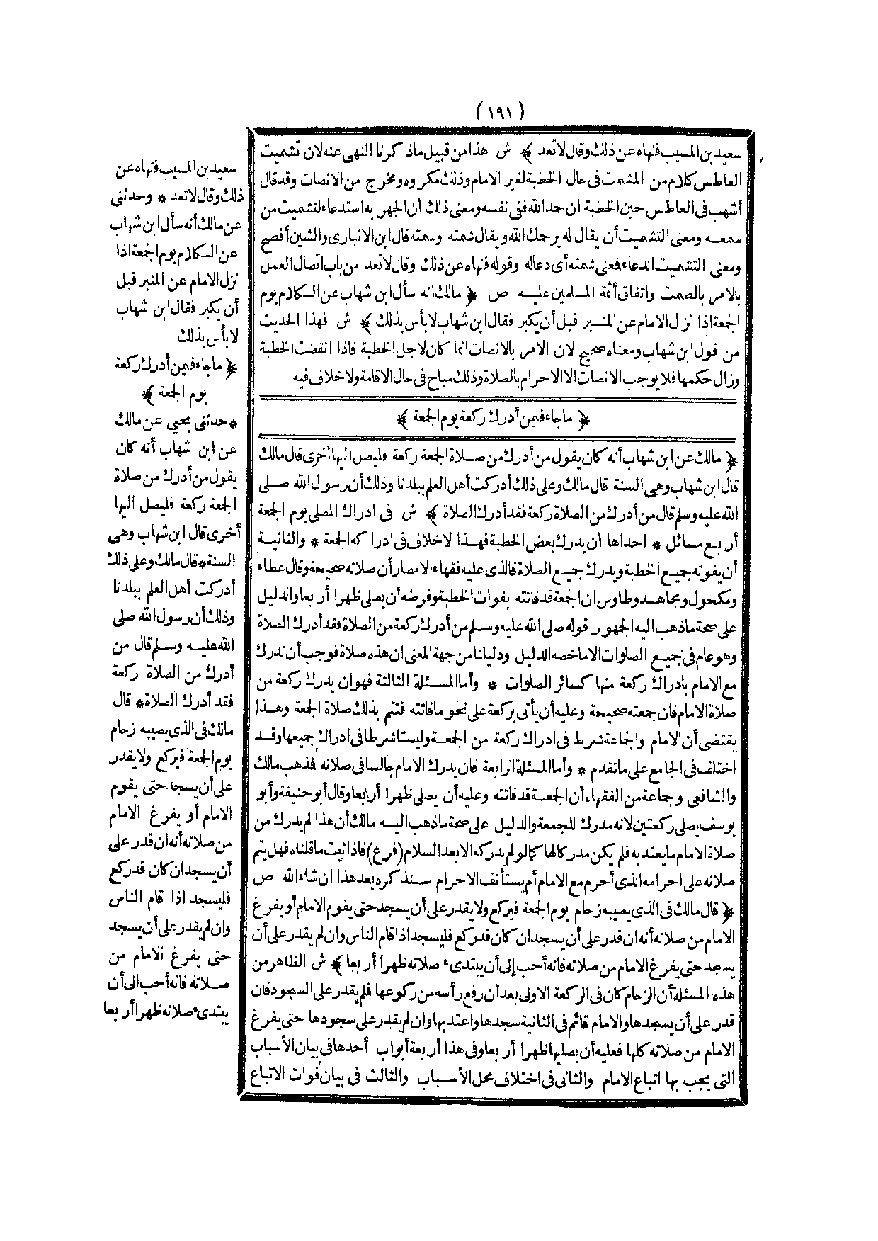 مَا جَاءَ فِيمَنْ أَدْرَكَ رَكْعَةً يَوْمَ الْجُمُعَةِ (ص) : (مَالِكٌ عَنْ ابْنِ شِهَابٍ أَنَّهُ كَانَ يَقُولُ مَنْ أَدْرَكَ مِنْ صَلَاةِ الْجُمُعَةِ رَكْعَةً فَلْيُصَلِّ إلَيْهَا أُخْرَى قَالَ مَالِكٌ قَالَ ابْنُ شِهَابٍ وَهِيَ السُّنَّةُ قَالَ مَالِكٌ وَعَلَى ذَلِكَ أَدْرَكْت أَهْلَ الْعِلْمِ بِبَلَدِنَا وَذَلِكَ أَنَّ رَسُولَ اللَّهِ - صَلَّى اللَّهُ عَلَيْهِ وَسَلَّمَ - قَالَ «مَنْ أَدْرَكَ مِنْ الصَّلَاةِ رَكْعَةً فَقَدْ أَدْرَكَ الصَّلَاةَ» )