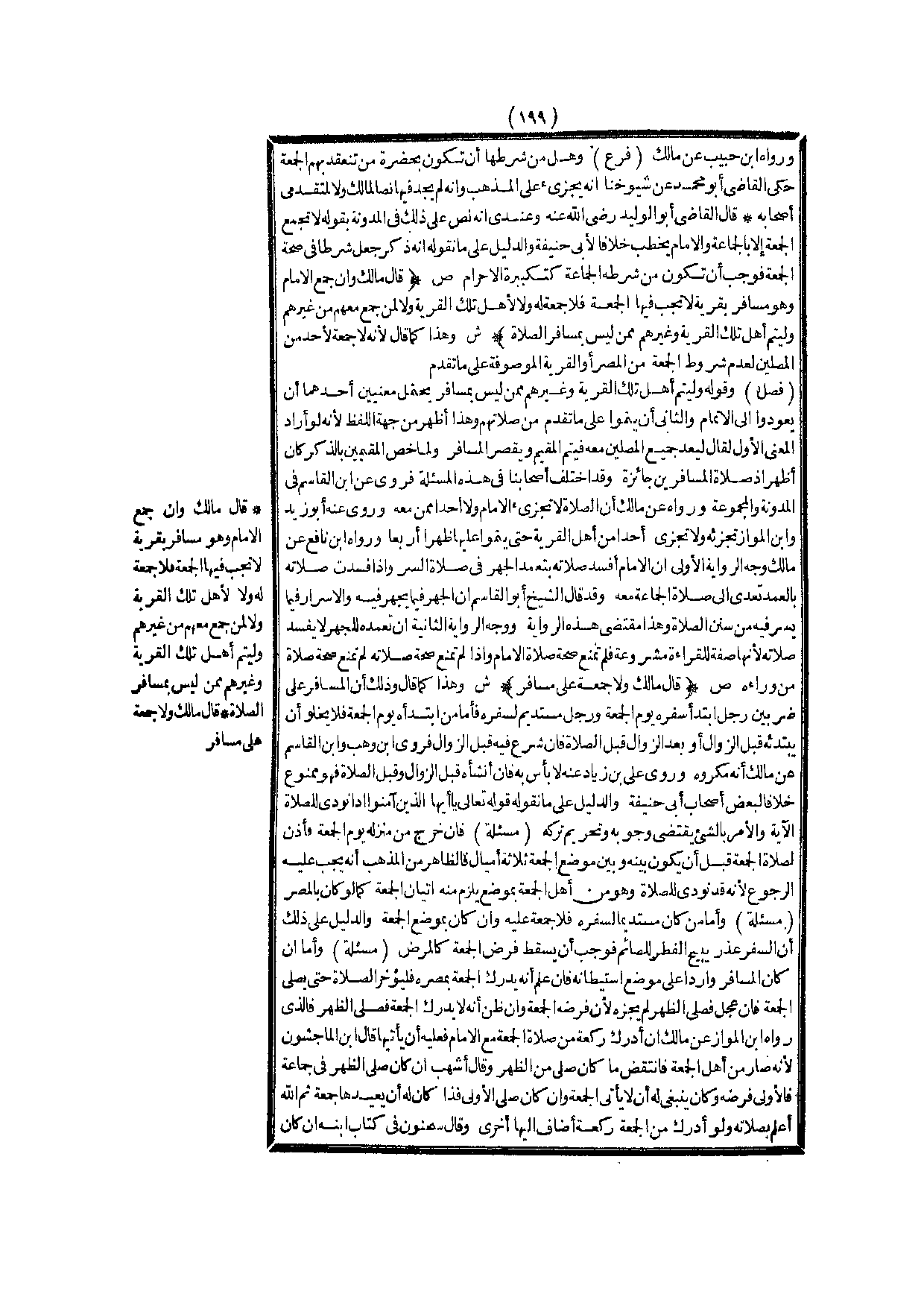(ص) : (قَالَ مَالِكٌ وَلَا جُمُعَةَ عَلَى مُسَافِرٍ) .