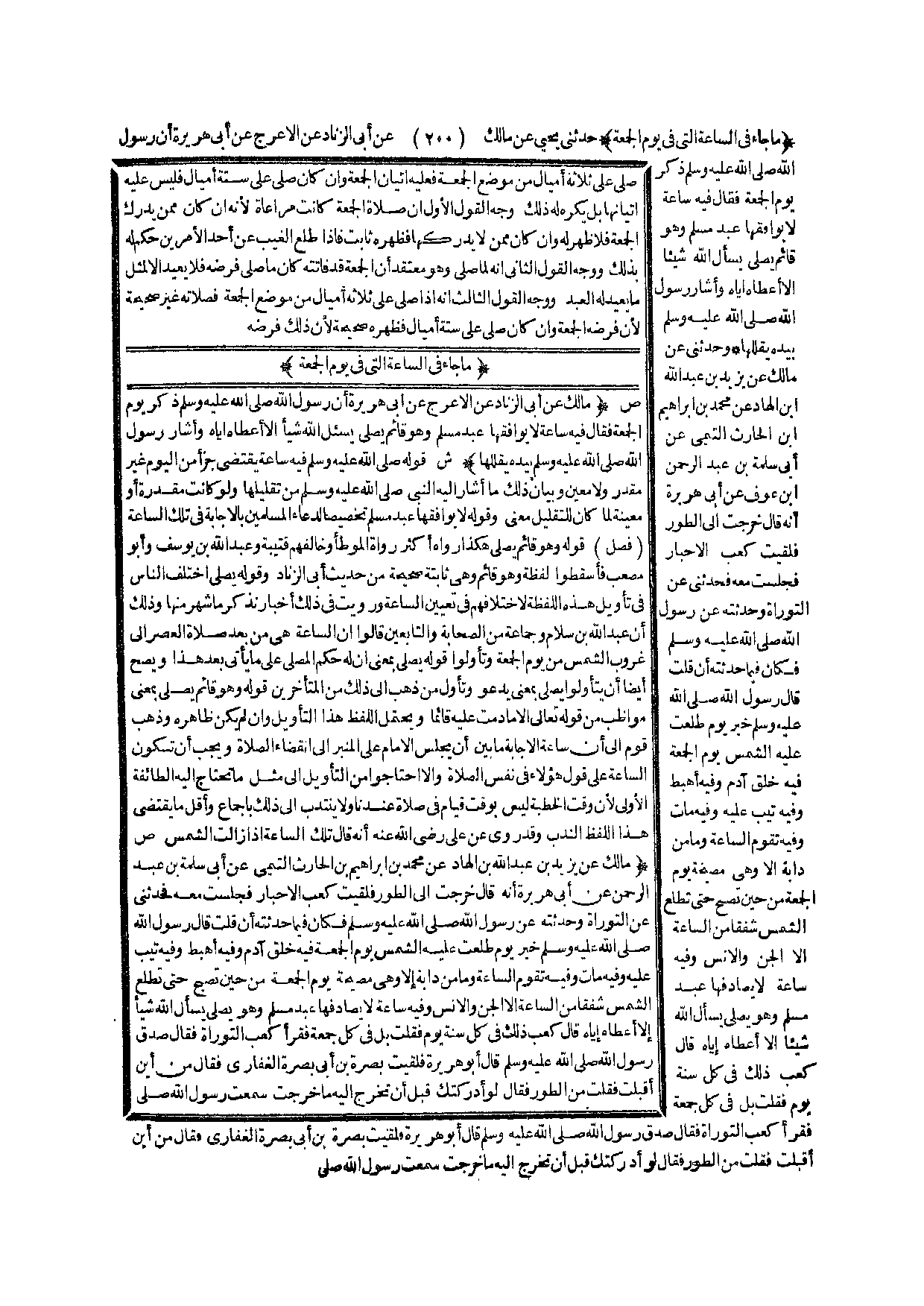 (ص) : (مَالِكٌ عَنْ يَزِيدَ بْنِ عَبْدِ اللَّهِ بْنِ الْهَادِ عَنْ مُحَمَّدِ بْنِ إبْرَاهِيمَ بْنِ الْحَارِسِ التَّيْمِيِّ عَنْ أَبِي سَلَمَةَ بْنِ عَبْدِ الرَّحْمَنِ عَنْ أَبِي هُرَيْرَةَ أَنَّهُ قَالَ «خَرَجْت إلَى الطُّورِ فَلَقِيت كَعْبَ الْأَحْبَارِ فَجَلَسْت مَعَهُ فَحَدَّثَنِي عَنْ التَّوْرَاةِ وَحَدَّثْته عَنْ رَسُولِ اللَّهِ - صَلَّى اللَّهُ عَلَيْهِ وَسَلَّمَ - فَكَانَ فِيمَا حَدَّثْته أَنْ قُلْت قَالَ رَسُولُ اللَّهِ - صَلَّى اللَّهُ عَلَيْهِ وَسَلَّمَ - خَيْرُ يَوْمٍ طَلَعَتْ عَلَيْهِ الشَّمْسُ يَوْمُ الْجُمُعَةِ فِيهِ خُلِقَ آدَم وَفِيهِ أُهْبِطَ وَفِيهِ تِيبَ عَلَيْهِ وَفِيهِ مَاتَ وَفِيهِ تَقُومُ السَّاعَةُ وَمَا مِنْ دَابَّةٍ إلَّا وَهِيَ مُصِيخَةٌ يَوْمَ الْجُمُعَةِ مِنْ حِينِ تُصْبِحُ حَتَّى تَطْلُعَ الشَّمْسُ شَفَقًا مِنْ السَّاعَةِ إلَّا الْجِنَّ وَالْإِنْسَ وَفِيهِ سَاعَةٌ لَا يُصَادِفُهَا عَبْدٌ مُسْلِمٌ وَهُوَ يُصَلِّي يَسْأَلُ اللَّهَ شَيْئًا إلَّا أَعْطَاهُ إيَّاهُ قَالَ كَعْبٌ ذَلِكَ فِي كُلِّ سَنَةٍ يَوْمٌ فَقُلْت بَلْ فِي كُلِّ جُمُعَةٍ فَقَرَأَ كَعْبٌ التَّوْرَاةَ فَقَالَ صَدَقَ رَسُولُ اللَّهِ - صَلَّى اللَّهُ عَلَيْهِ وَسَلَّمَ - قَالَ أَبُو هُرَيْرَةَ فَلَقِيتُ بَصْرَةَ بْنَ أَبِي بَصْرَةَ الْغِفَارِيَّ فَقَالَ مِنْ أَيْنَ أَقْبَلْت فَقُلْت مِنْ الطُّورِ فَقَالَ لَوْ أَدْرَكْتُكَ قَبْلَ أَنْ تَخْرُجَ إلَيْهِ مَا خَرَجْتَ سَمِعْتُ رَسُولَ اللَّهِ - صَلَّى اللَّهُ عَلَيْهِ وَسَلَّمَ -