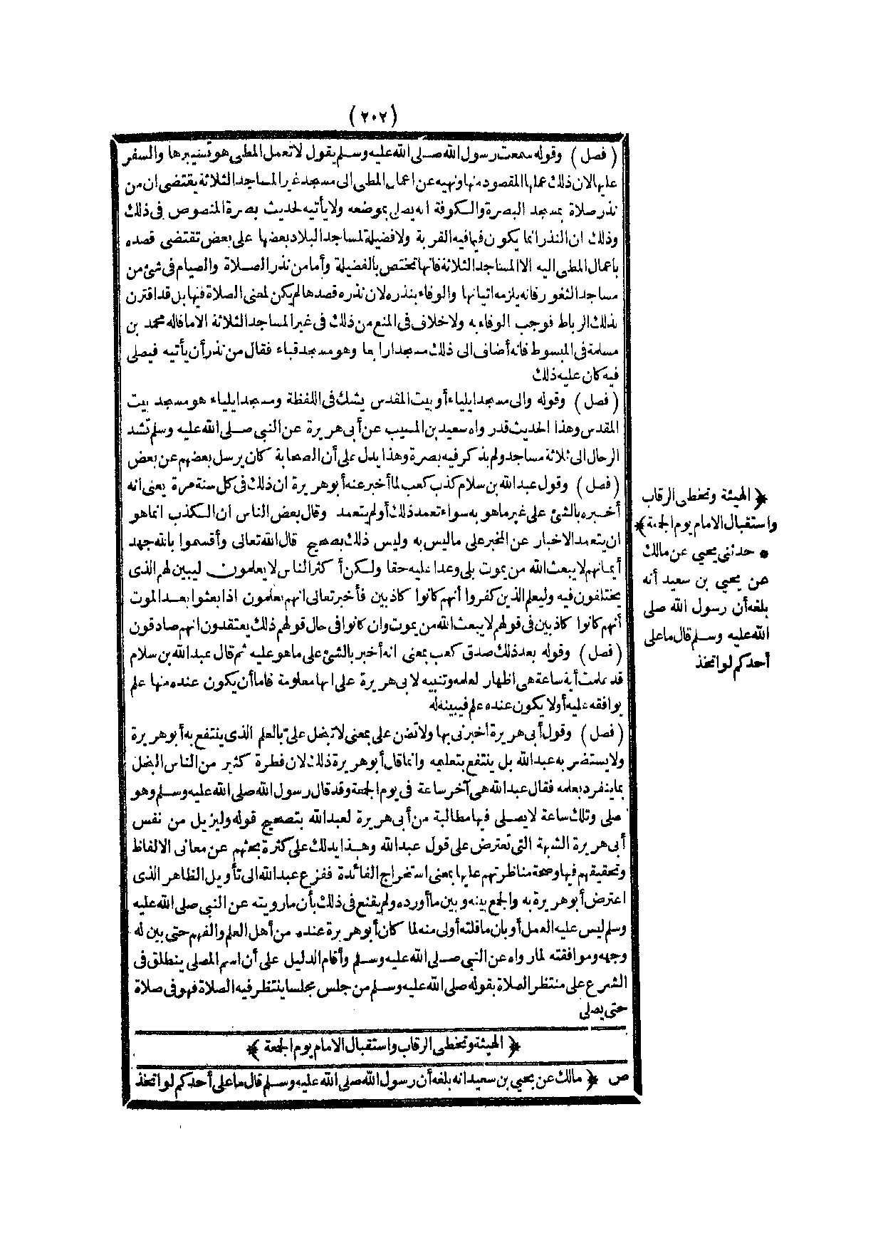 الْهَيْئَةُ وَتَخَطِّي الرِّقَابِ وَاسْتِقْبَالُ الْإِمَامِ يَوْمَ الْجُمُعَةِ (ص) : (مَالِكٌ عَنْ يَحْيَى بْنِ سَعِيدٍ أَنَّهُ بَلَغَهُ أَنَّ رَسُولَ اللَّهِ - صَلَّى اللَّهُ عَلَيْهِ وَسَلَّمَ - قَالَ «مَا عَلَى أَحَدِكُمْ لَوْ اتَّخَذَ