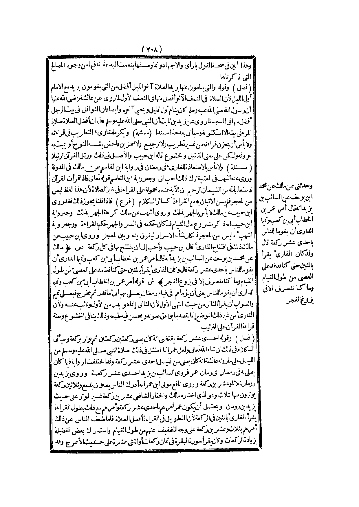 (ص) : (مَالِكٌ عَنْ مُحَمَّدِ بْنِ يُوسُفَ عَنْ السَّائِبِ بْنِ يَزِيدَ أَنَّهُ قَالَ أَمَرَ عُمَرُ بْنُ الْخَطَّابِ أُبَيَّ بْنَ كَعْبٍ وَتَمِيمًا الدَّارِيَّ أَنْ يَقُومَا لِلنَّاسِ بِإِحْدَى عَشْرَةَ رَكْعَةً قَالَ وَكَانَ الْقَارِئُ يَقْرَأُ بِالْمِئِينَ حَتَّى كُنَّا نَعْتَمِدُ عَلَى الْعِصِيِّ مِنْ طُولِ الْقِيَامِ وَمَا كُنَّا نَنْصَرِفُ إلَّا فِي بُزُوغِ الْفَجْرِ) .