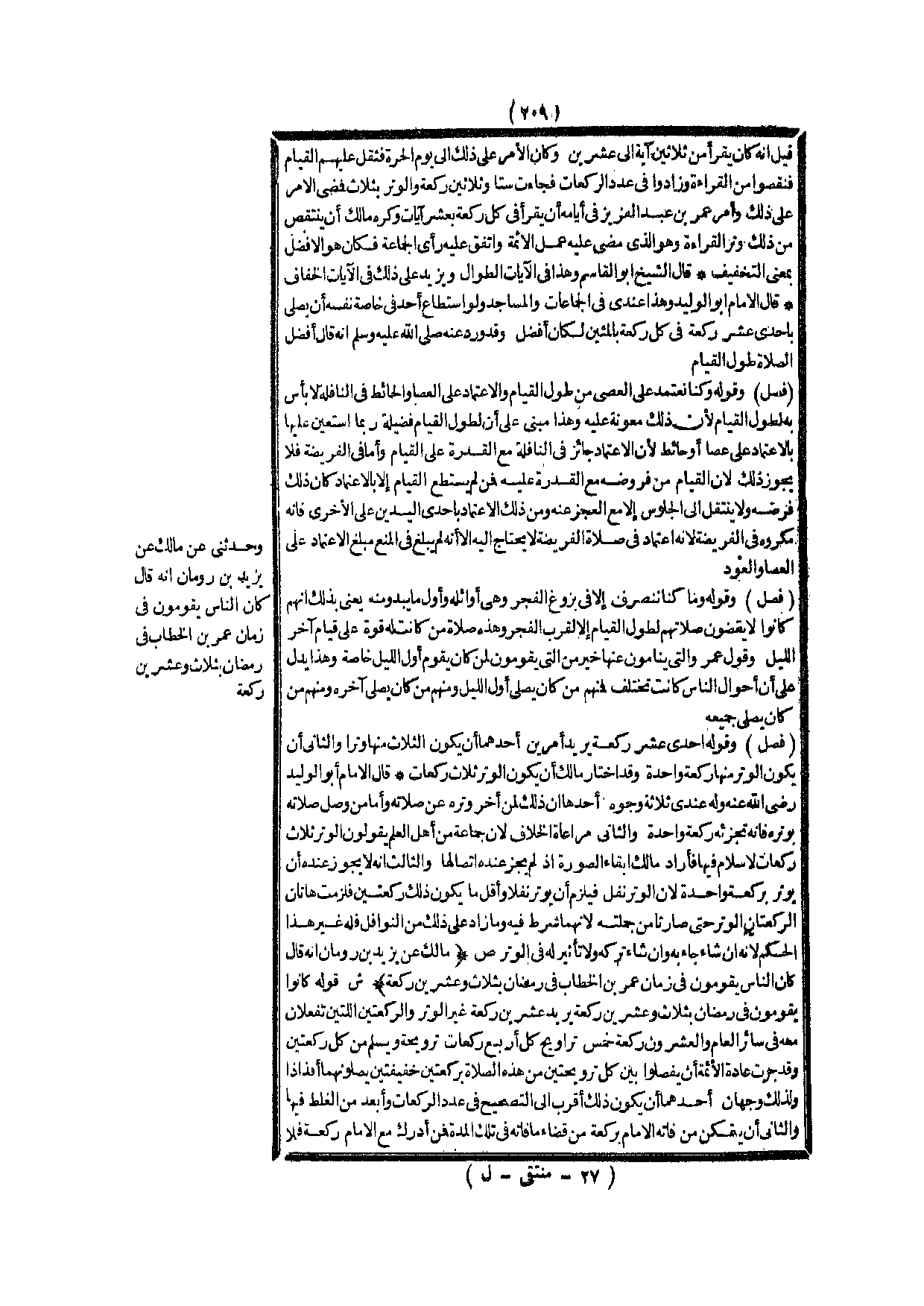 (ص) : (مَالِكٌ عَنْ يَزِيدَ بْنِ رُومَانَ أَنَّهُ قَالَ كَانَ النَّاسُ يَقُومُونَ فِي زَمَانِ عُمَرَ بْنِ الْخَطَّابِ فِي رَمَضَانَ بِثَلَاثٍ وَعِشْرِينَ رَكْعَةً) .