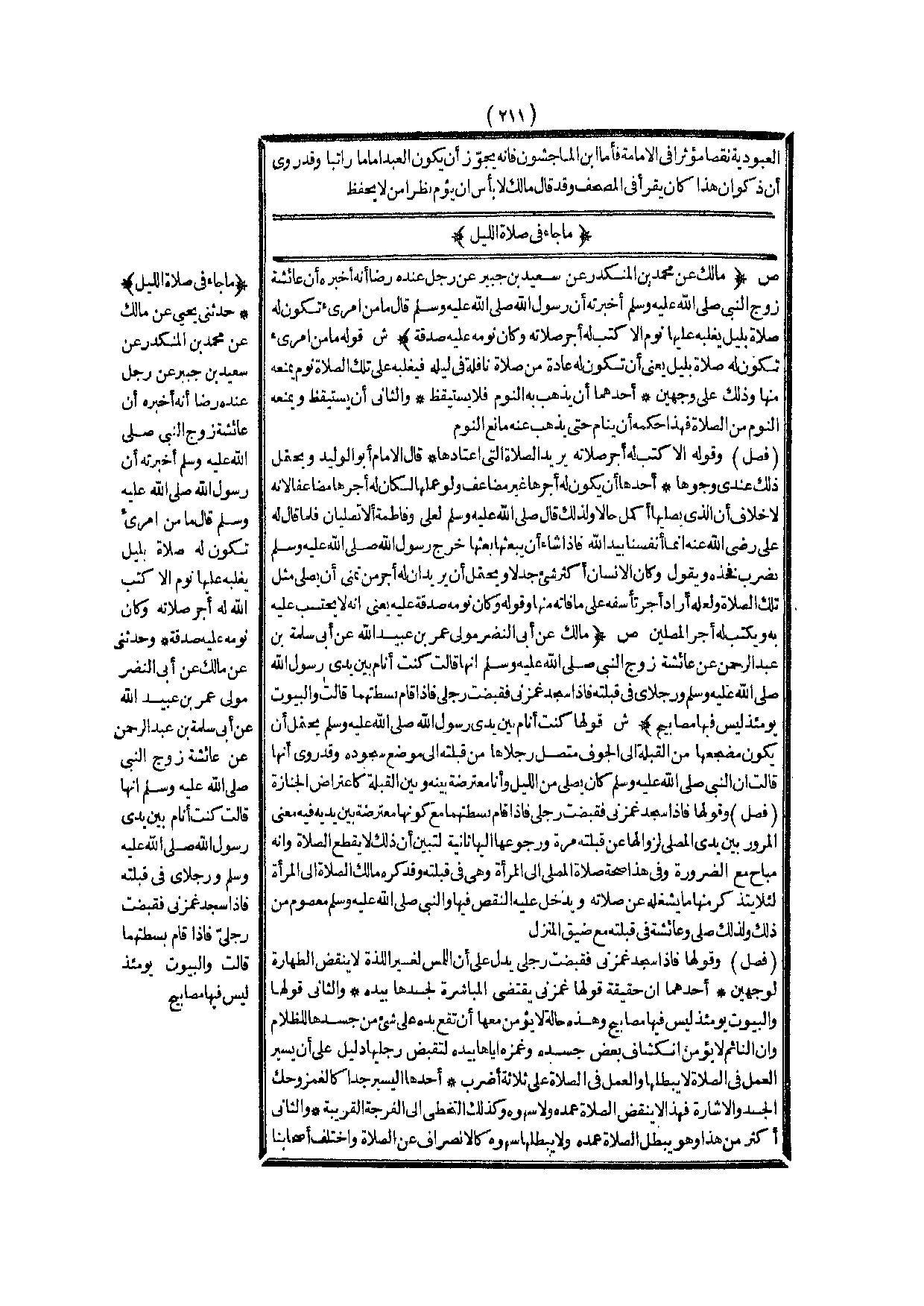 مَا جَاءَ فِي صَلَاةِ اللَّيْلِ (ص) : (مَالِكٌ عَنْ مُحَمَّدِ بْنِ الْمُنْكَدِرِ عَنْ سَعِيدِ بْنِ جُبَيْرٍ عَنْ رَجُلٍ عِنْدَهُ رِضًا أَنَّهُ أَخْبَرَهُ أَنَّ عَائِشَةَ زَوْجَ النَّبِيِّ - صَلَّى اللَّهُ عَلَيْهِ وَسَلَّمَ - أَخْبَرَتْهُ أَنَّ رَسُولَ اللَّهِ - صَلَّى اللَّهُ عَلَيْهِ وَسَلَّمَ - قَالَ «مَا مِنْ امْرِئٍ تَكُونُ لَهُ صَلَاةٌ بِلَيْلٍ يَغْلِبُهُ عَلَيْهَا نَوْمٌ إلَّا كُتِبَ لَهُ أَجْرُ صَلَاتِهِ وَكَانَ نَوْمُهُ عَلَيْهِ صَدَقَةً» ) .